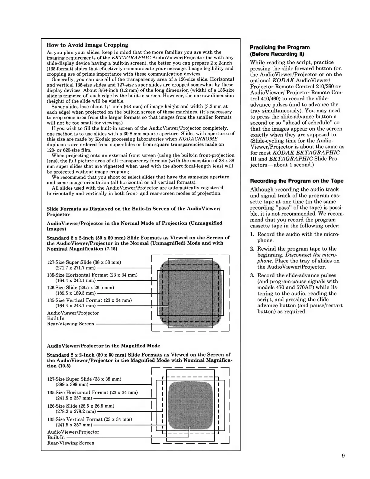 Kodak EKTAGRAPHIC 270 - How to Avoid Image Cropping; Practicing the Program (before Recording It); Recording the Program on the Tape