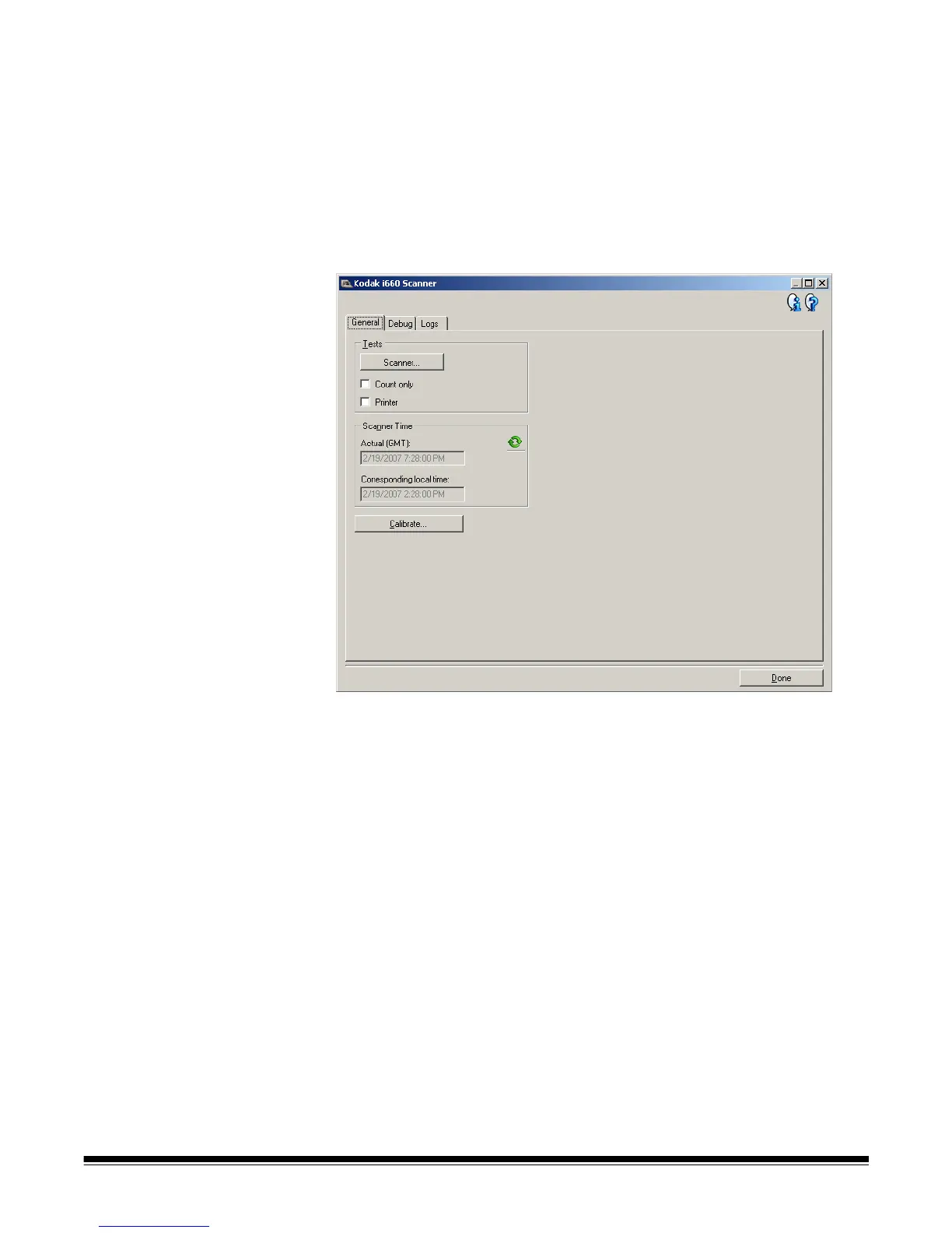 Diagnostics - General tab The General tab allows you to perform a scanner test, calibrate the