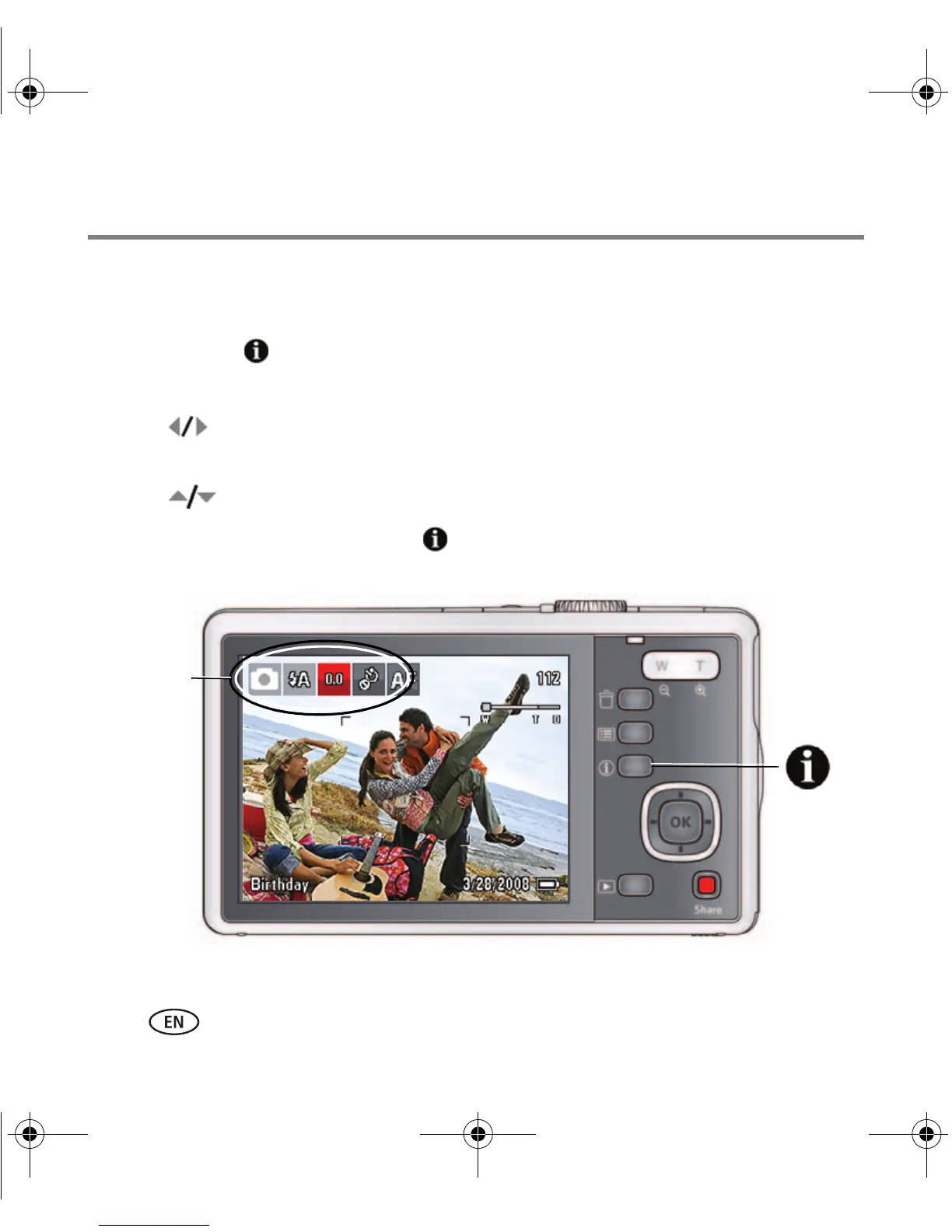 2 Press to access functions like Exposure Compensation, Self-timer/Burst, and