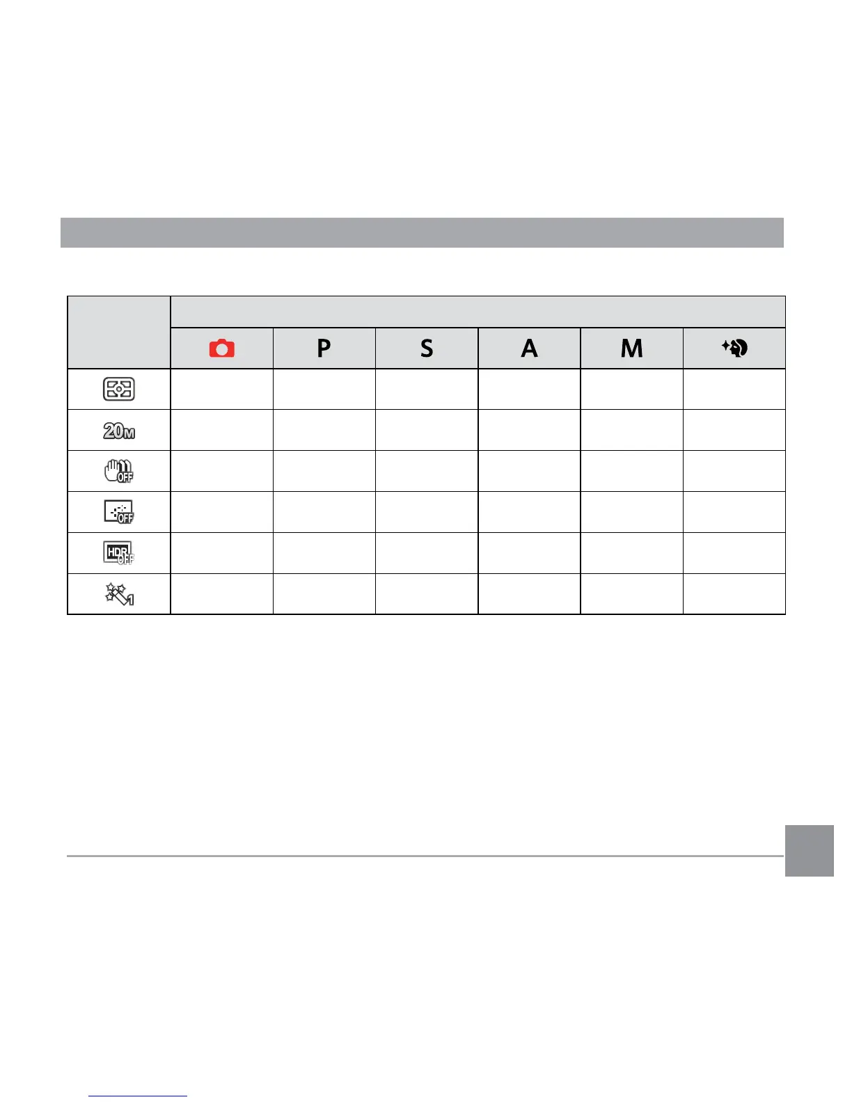 • Shooting menu in the shooting mode (O: Optional X: Not optional)