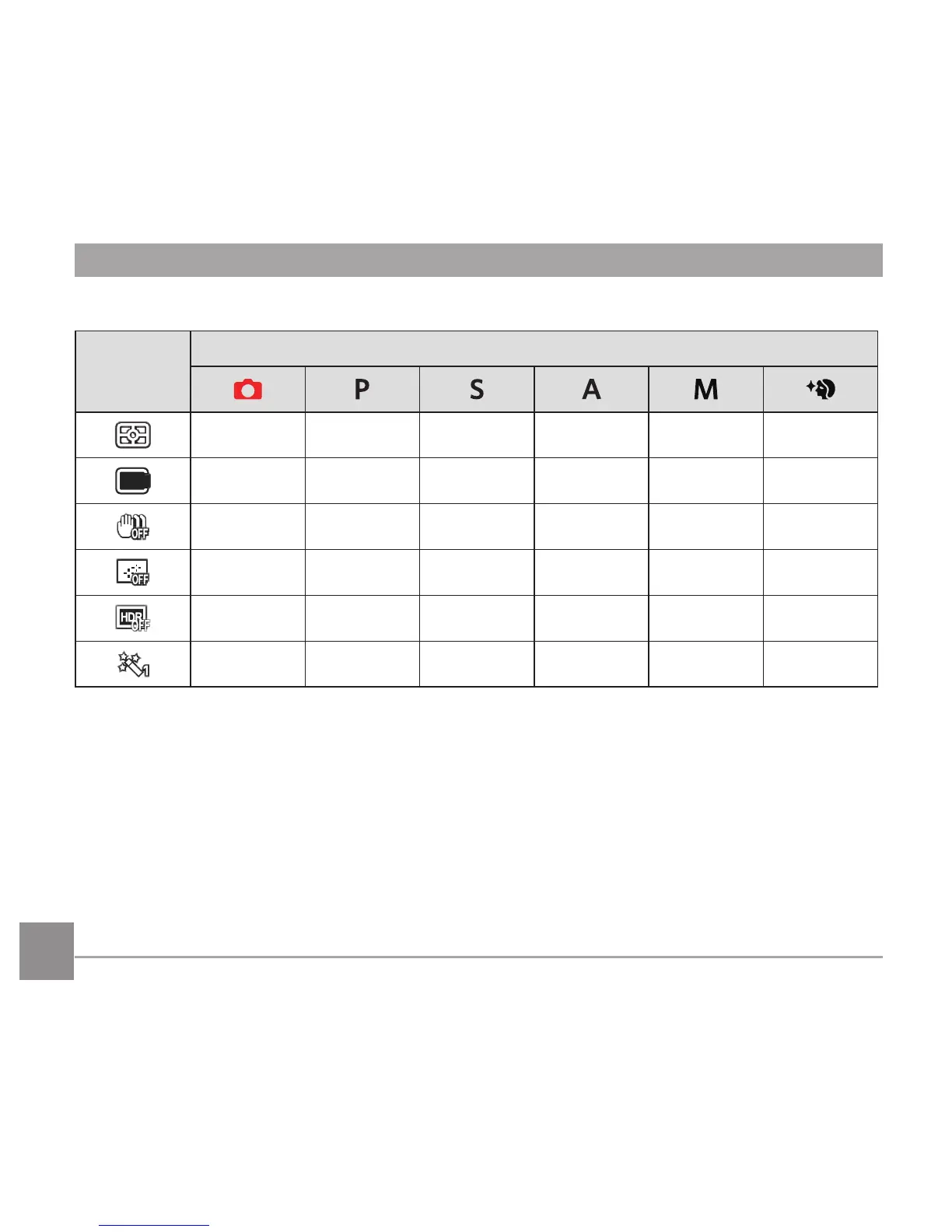 • Shooting menu in the shooting mode (O: Optional X: Not optional)