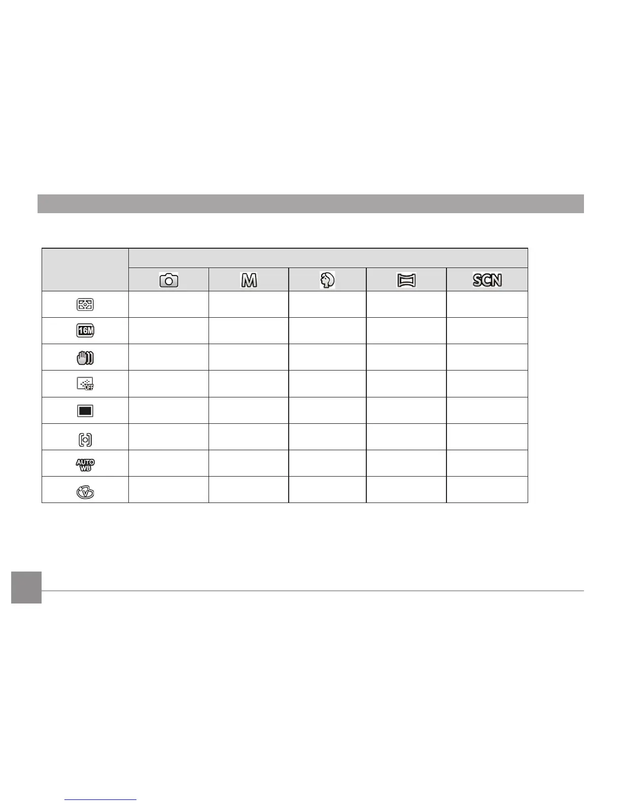 • Options in the shooting mode (O: Disponible X: Indisponible)