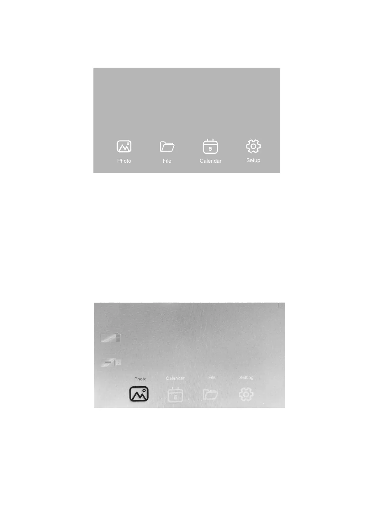 2. Press the Left and Right Arrow Buttons to select Photo, Calendar, File or Setup.