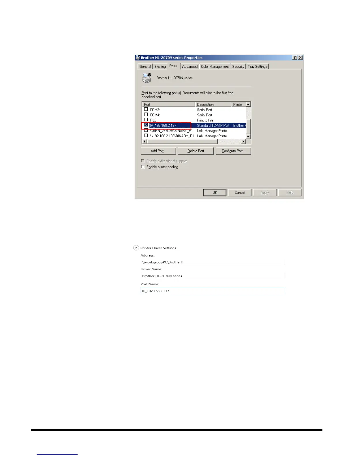 \\workgrouppc\BrotherH) in the Address field.