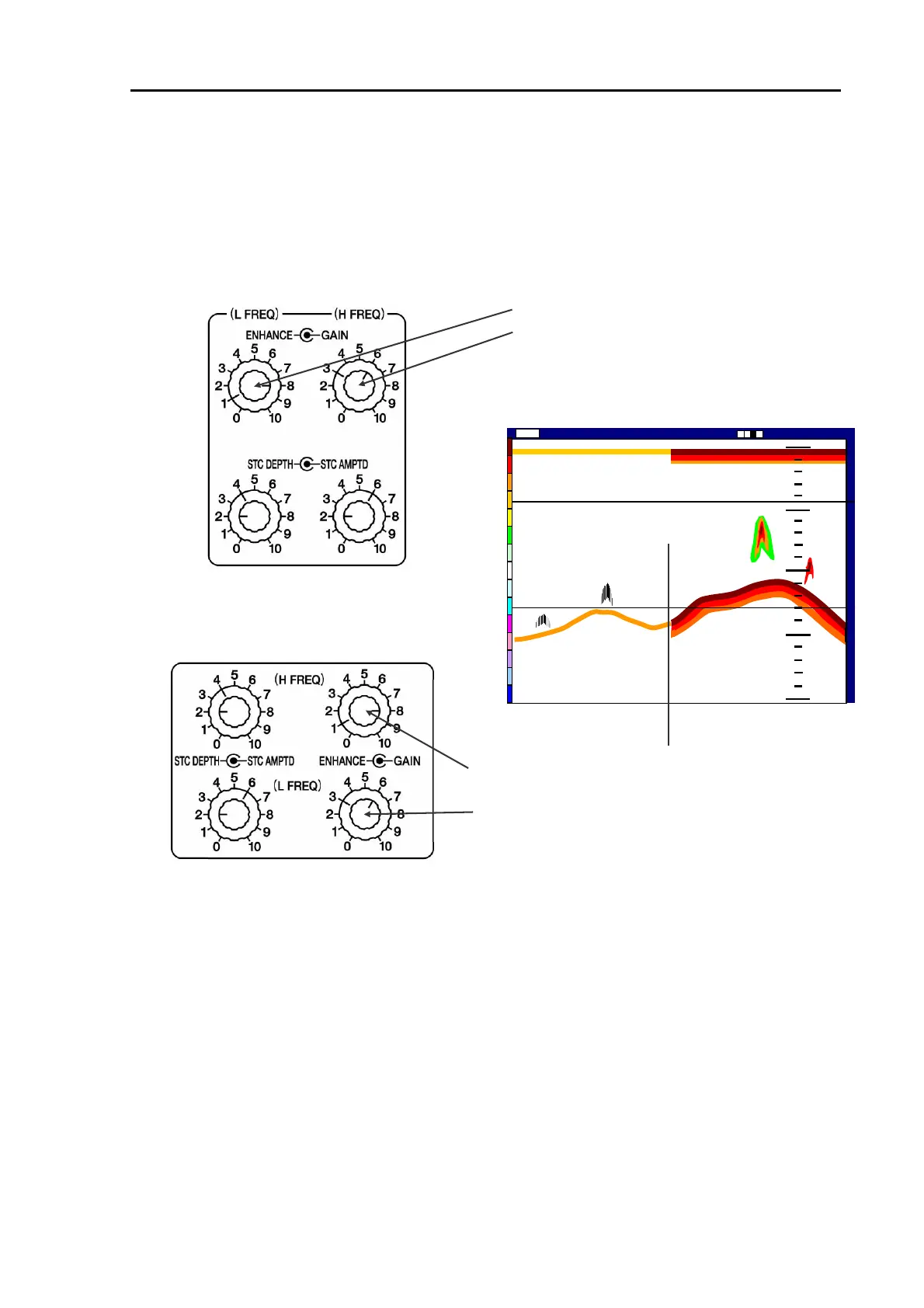 Turn the H FREQ GAIN or L FREQ GAIN control as appropriate to make the bottom echo displayed in