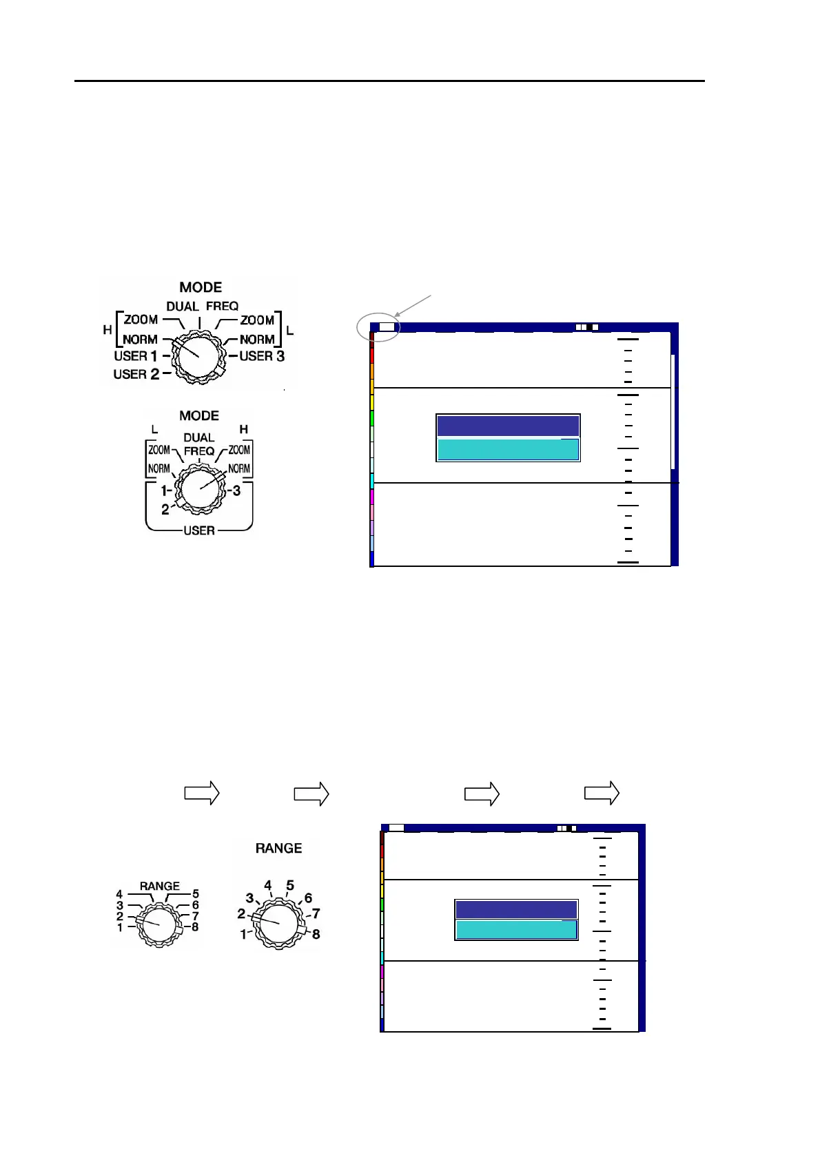 (1) Turn the RANGE switch to select the desired depth range, which is shown on the screen for
