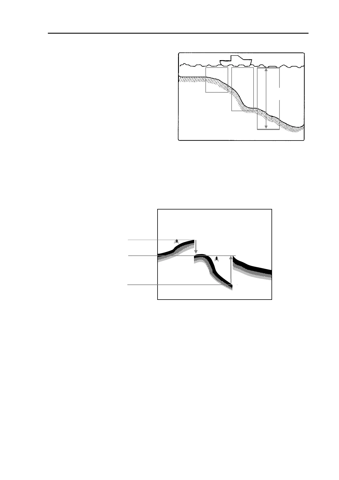 Displays a seabed echo of varying depth within the screen. When the seabed depth becomes