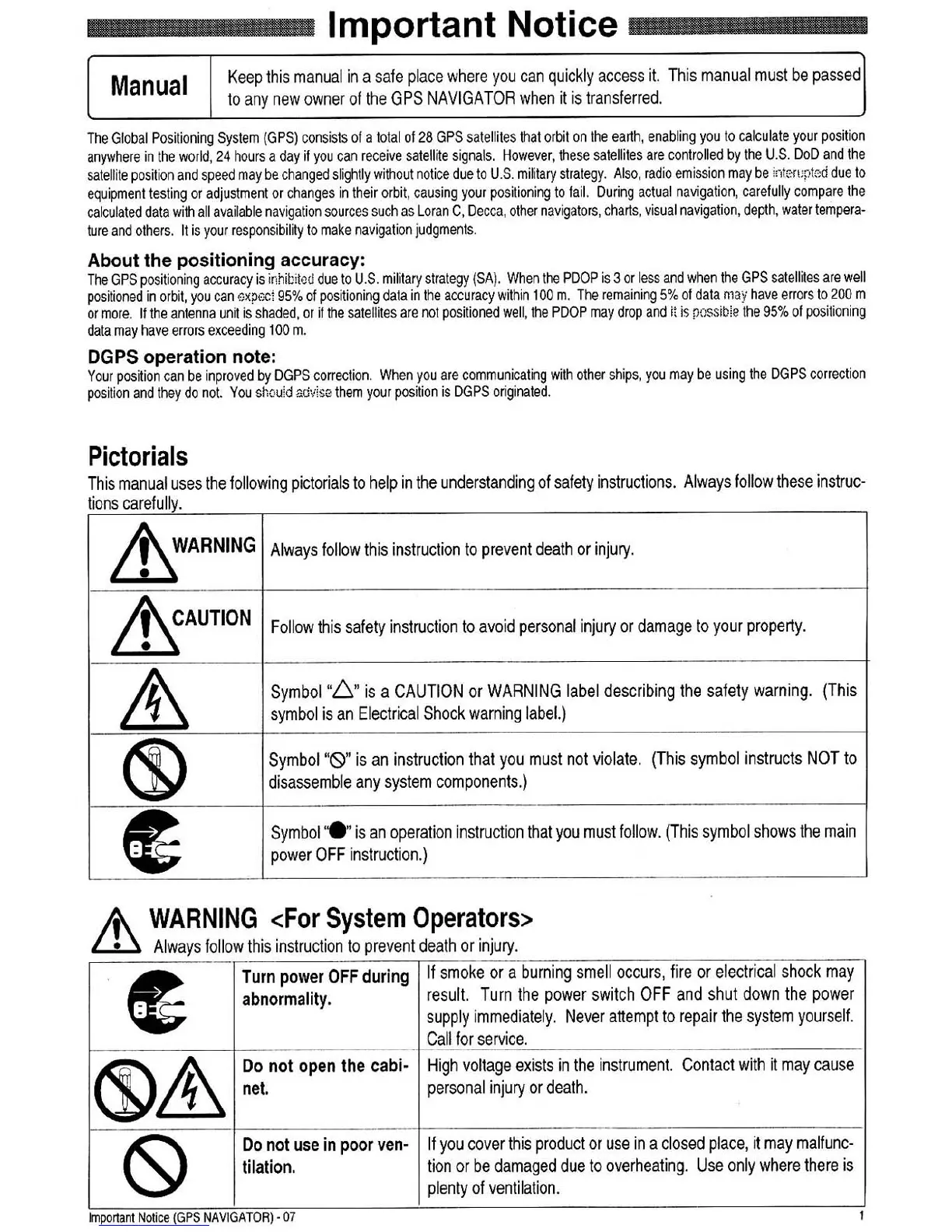 Koden KGP-913 - Important Notice; Positioning Accuracy and DGPS Operation Notes