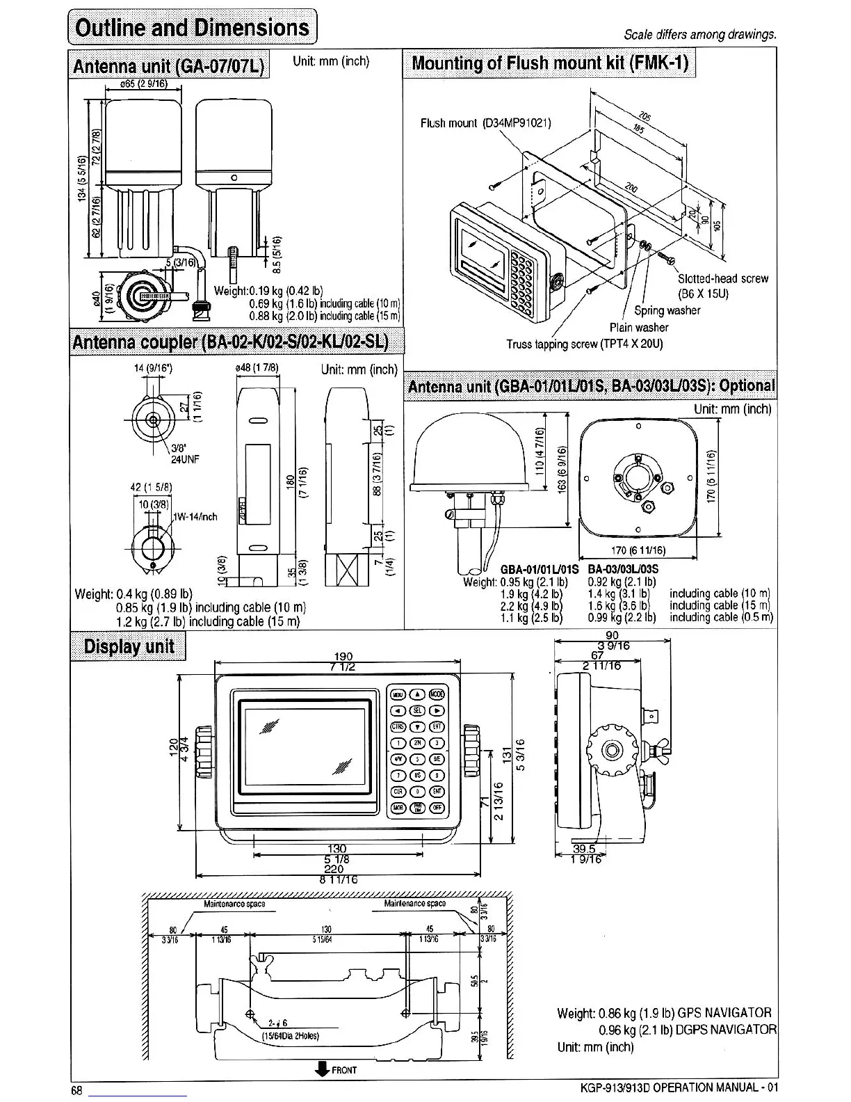 Koden KGP-913 - Outline and Dimensions; Antenna Unit; Mounting of Flush Mount Kit (FMK-1); Antenna Coupler