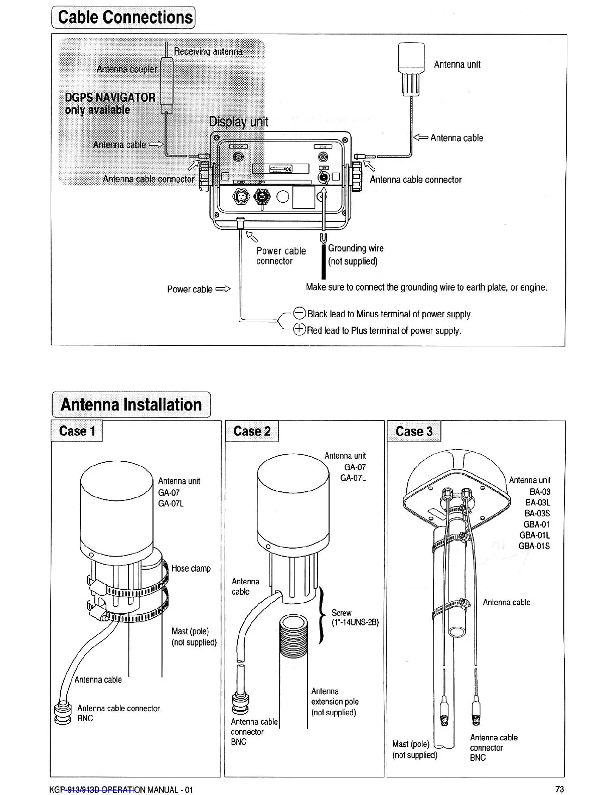 Koden KGP-913 - Cable Connections; DGPS Navigator Only Available; Antenna Installation