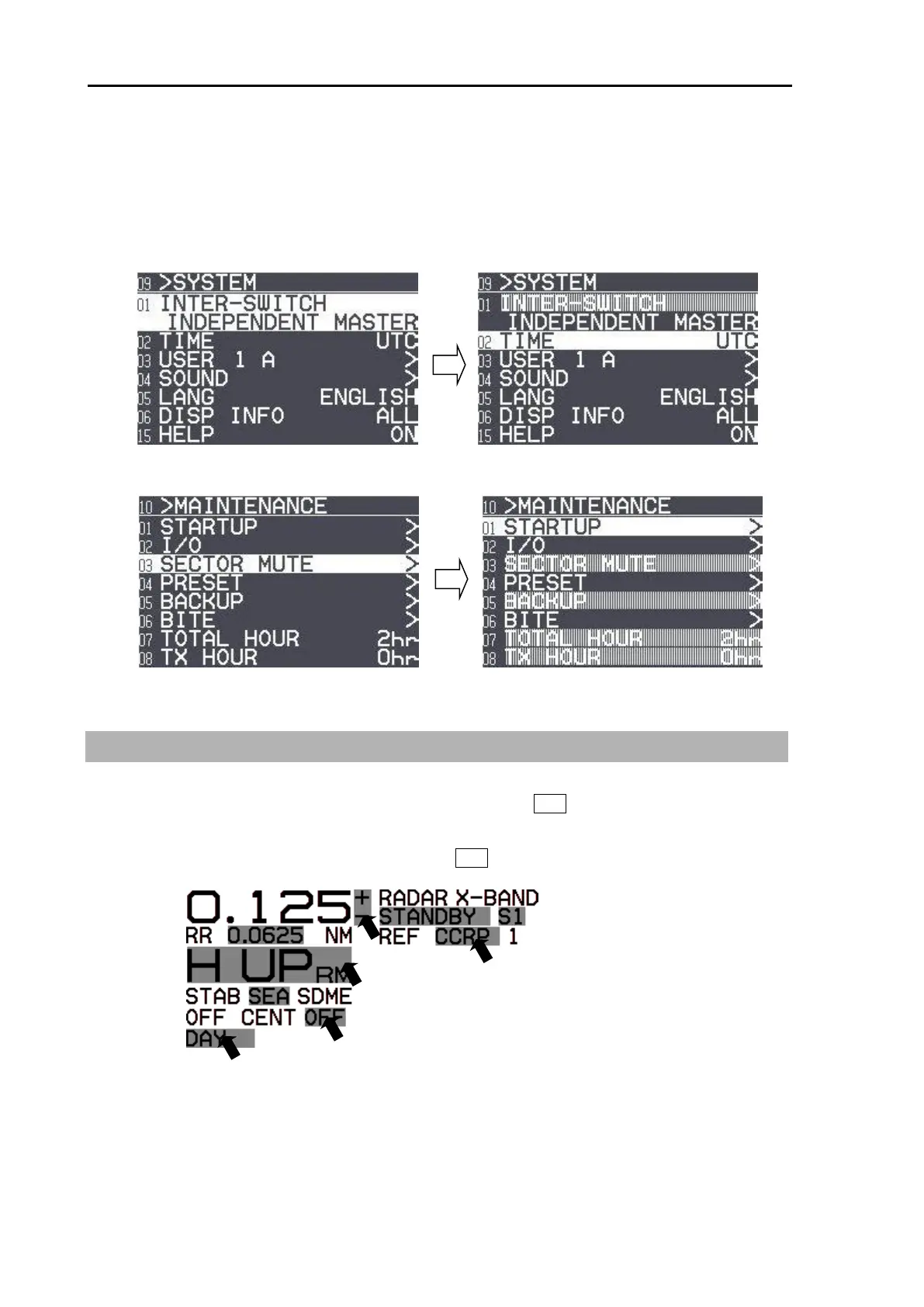 [INTER-SWITCH] in [SYSTEM] menu, and [SECTOR MUTE], [BACKUP], [TOTAL HOUR] and [TX