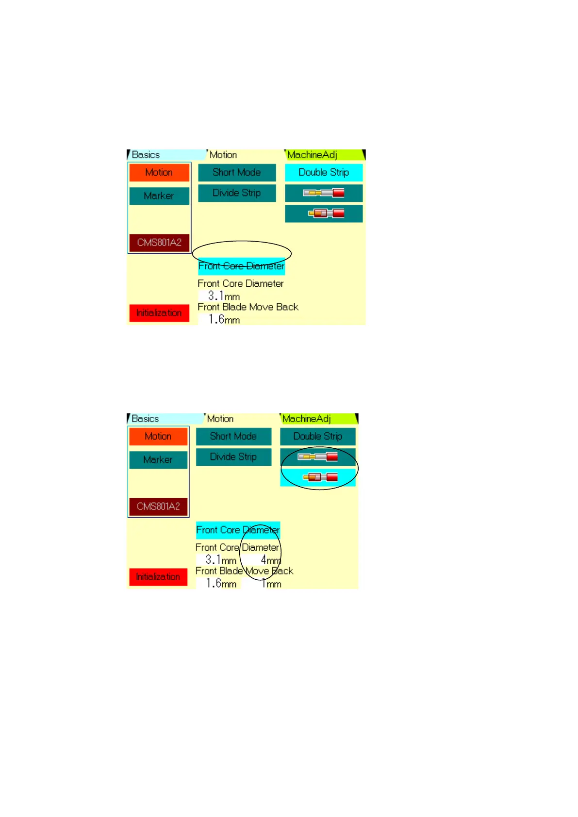 In case of setting on an upper figure ,A front core diameter is 3.1mm and Blade Move Back is 1.6mm,