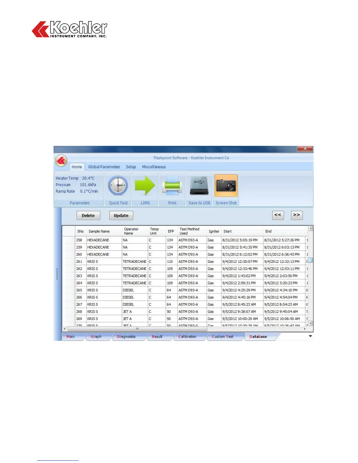 10. Database Screen - Clicking on the Database tab will display the Analyzers Database as shown in