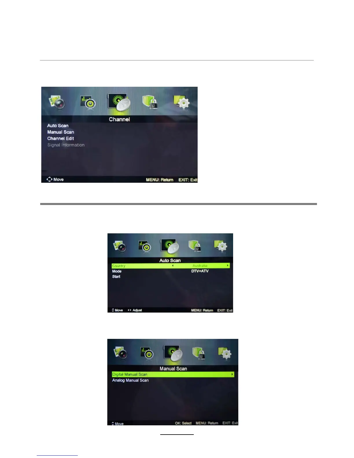 Auto Search: Enter the Auto Scan menu to start auto scan.