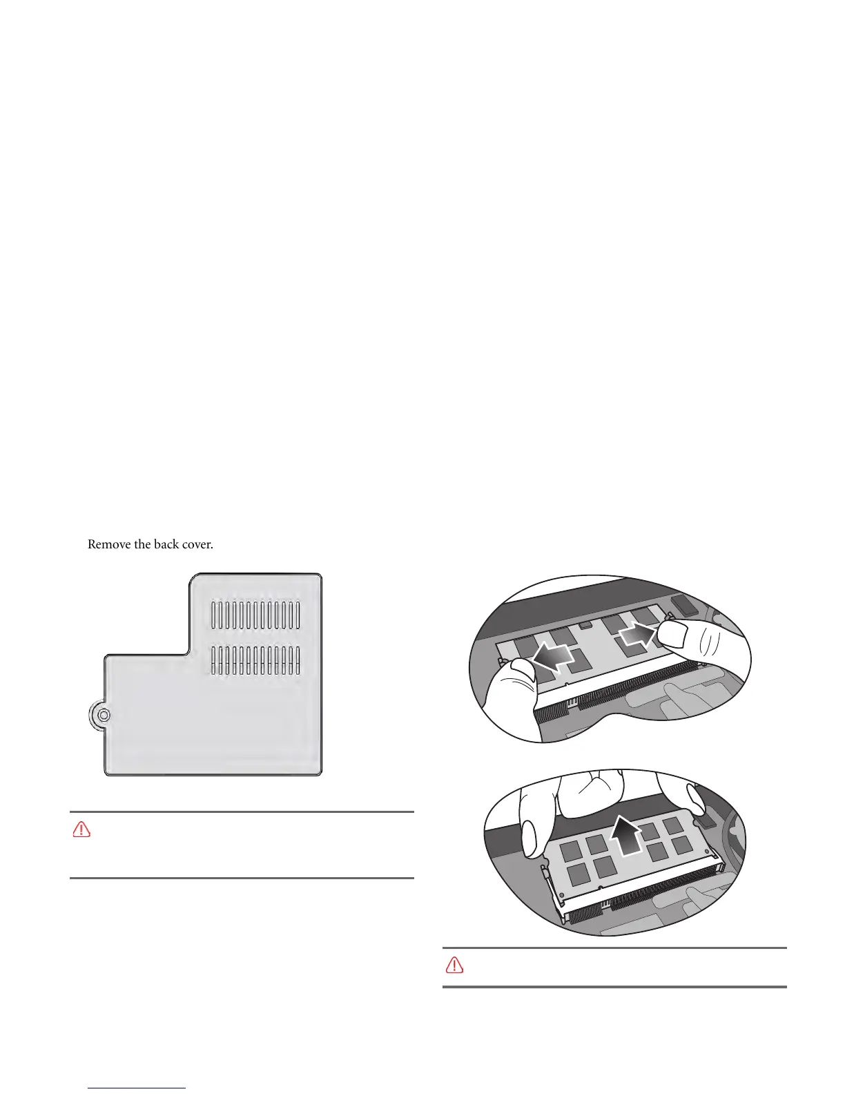 emove the back cover. 6. Release the existing memory module by pushing aside the