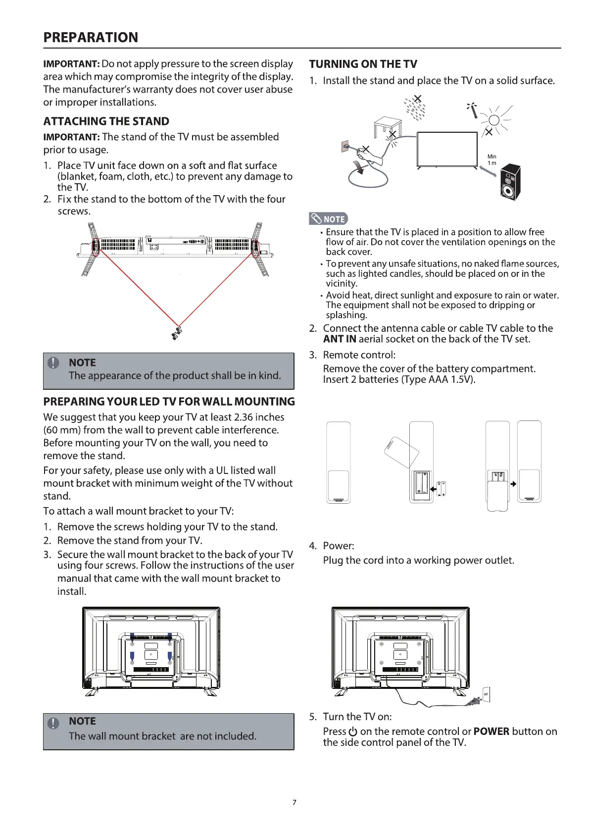 Kogan Android TV 9 Series - Preparation; Attaching the Stand; Preparing for Wall Mounting; Turning On the TV