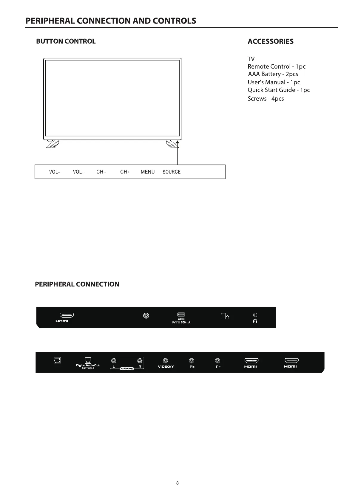 Kogan Android TV 9 Series - Peripheral Connection and Controls; Button Control Overview; Peripheral Connection Ports; Included Accessories