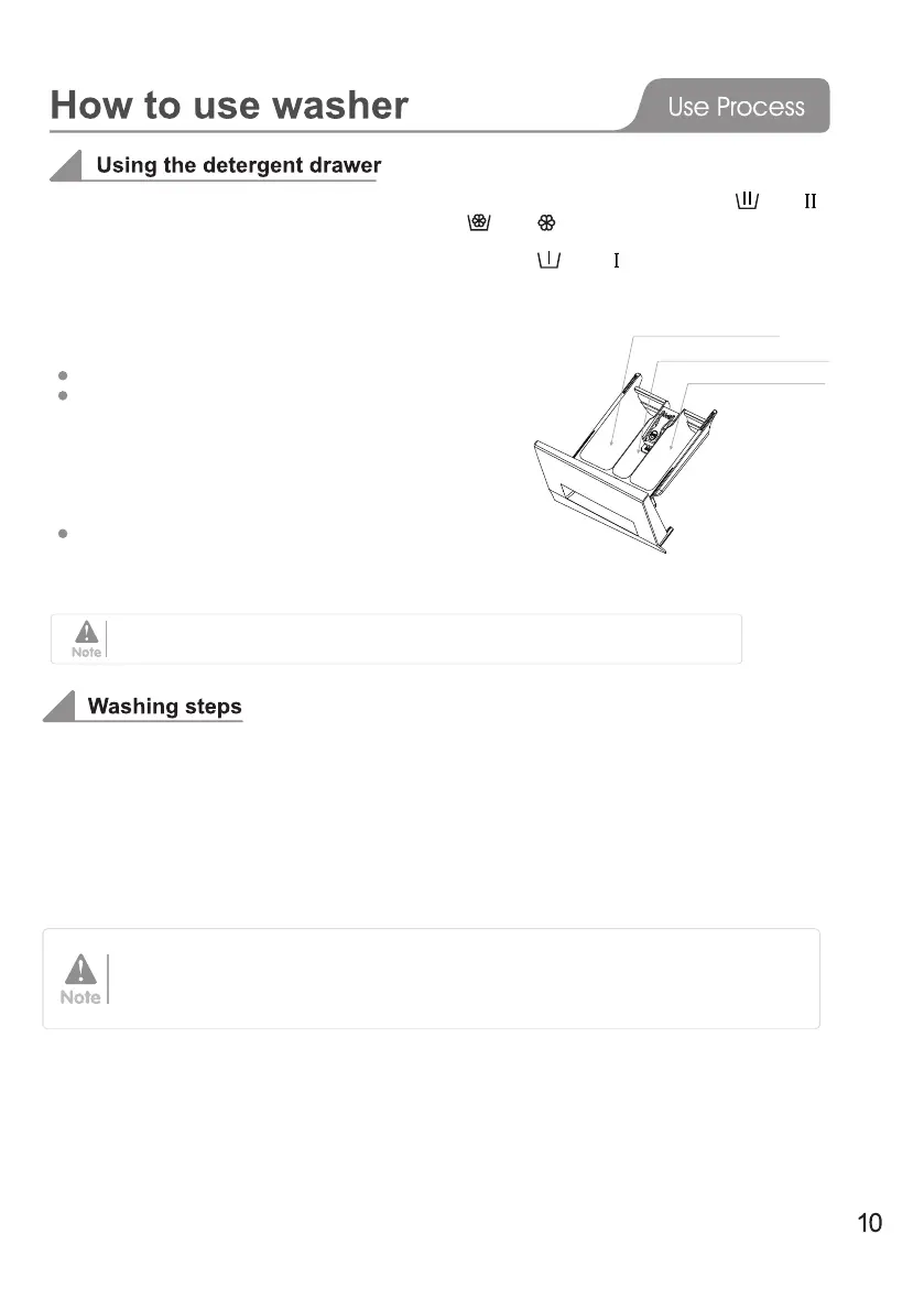 1. Open the drawer and add adequate detergent into main wash compartment marked “ ” or “ ”.