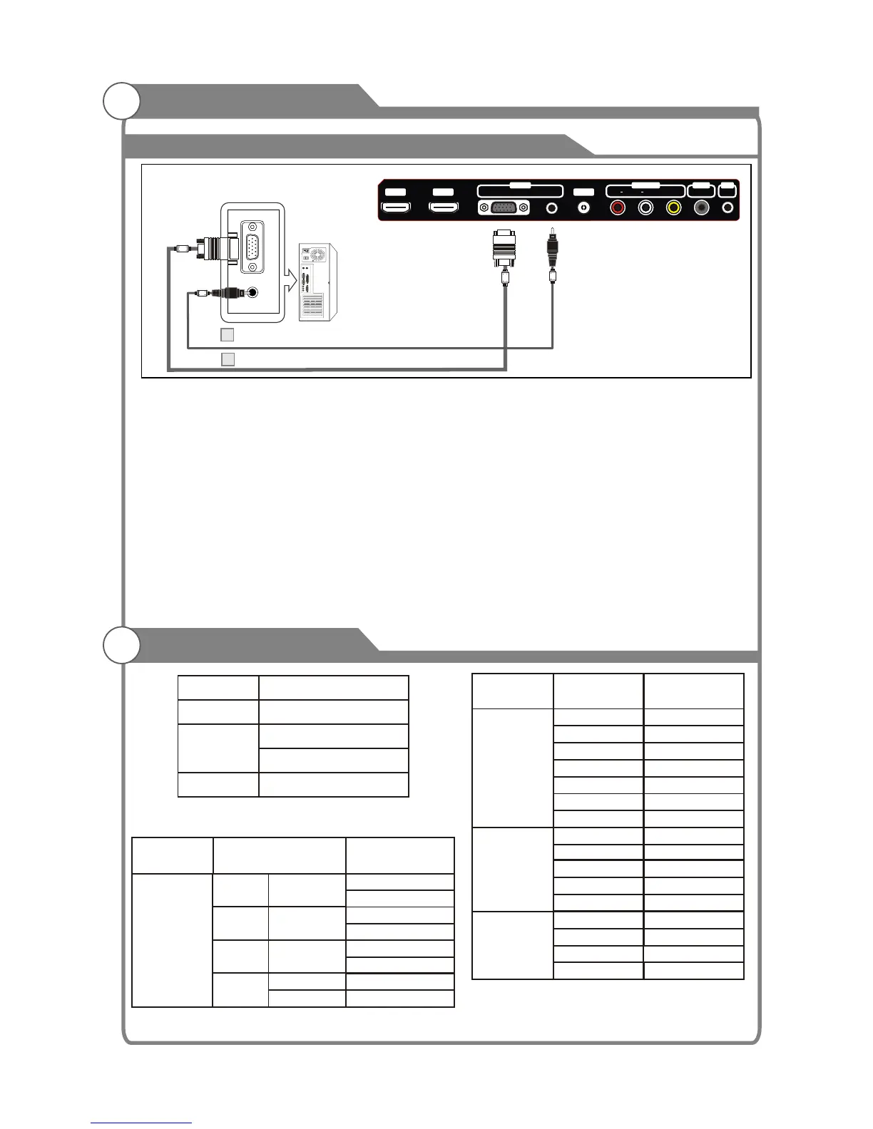 1. Connect a D-Sub Cable between VGA/PC IN connector on the TV and the PC output