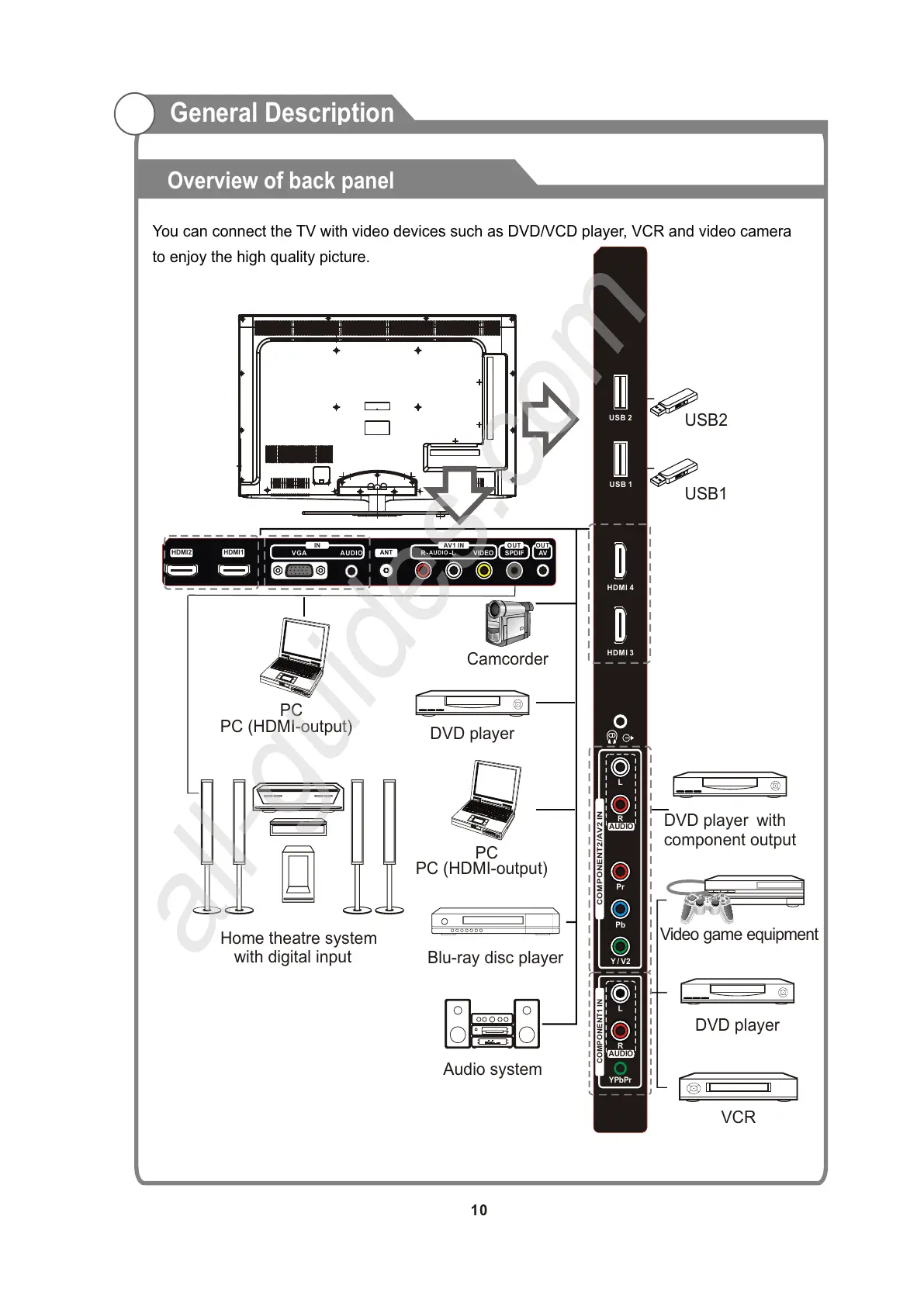 You can connect the TV with video devices such as DVD/VCD player, VCR and video camera