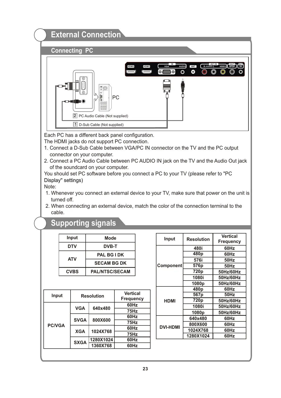 1. Connect a D-Sub Cable between VGA/PC IN connector on the TV and the PC output