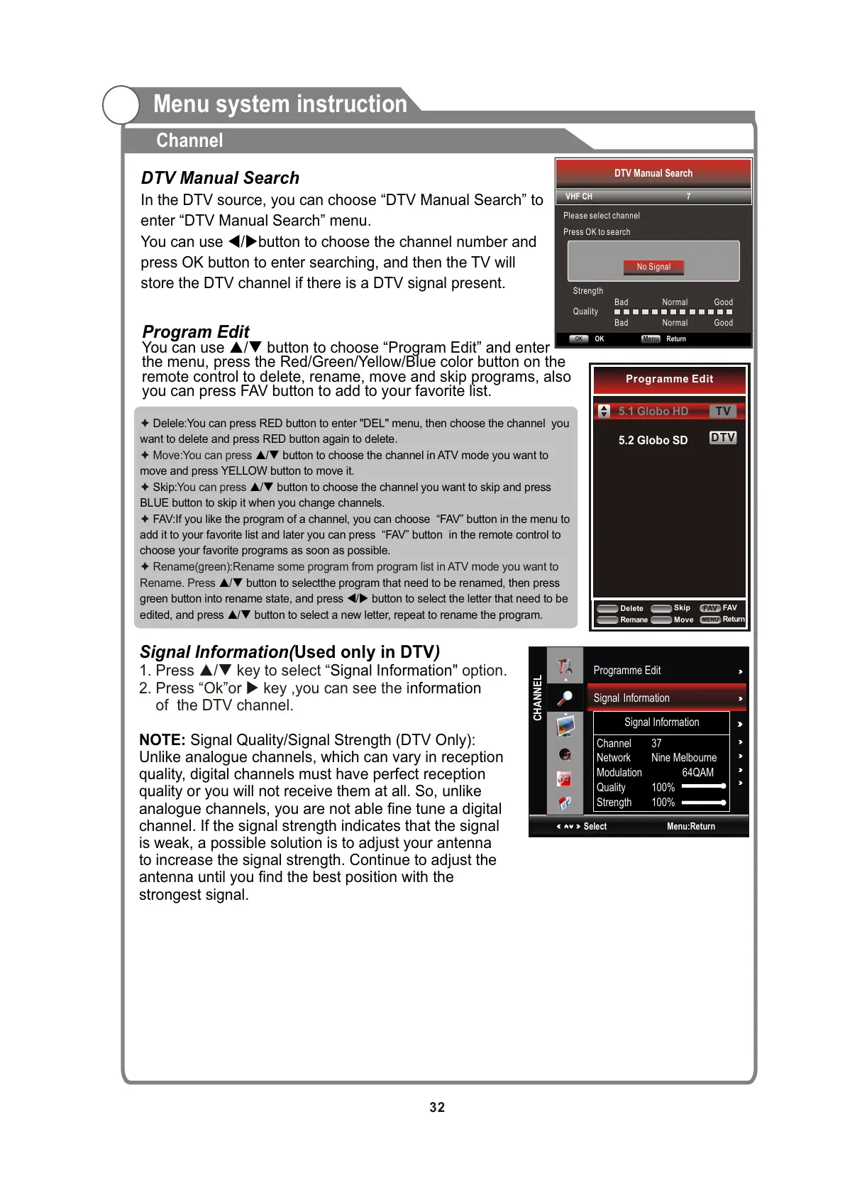 NOTE: Signal Quality/Signal Strength (DTV Only):