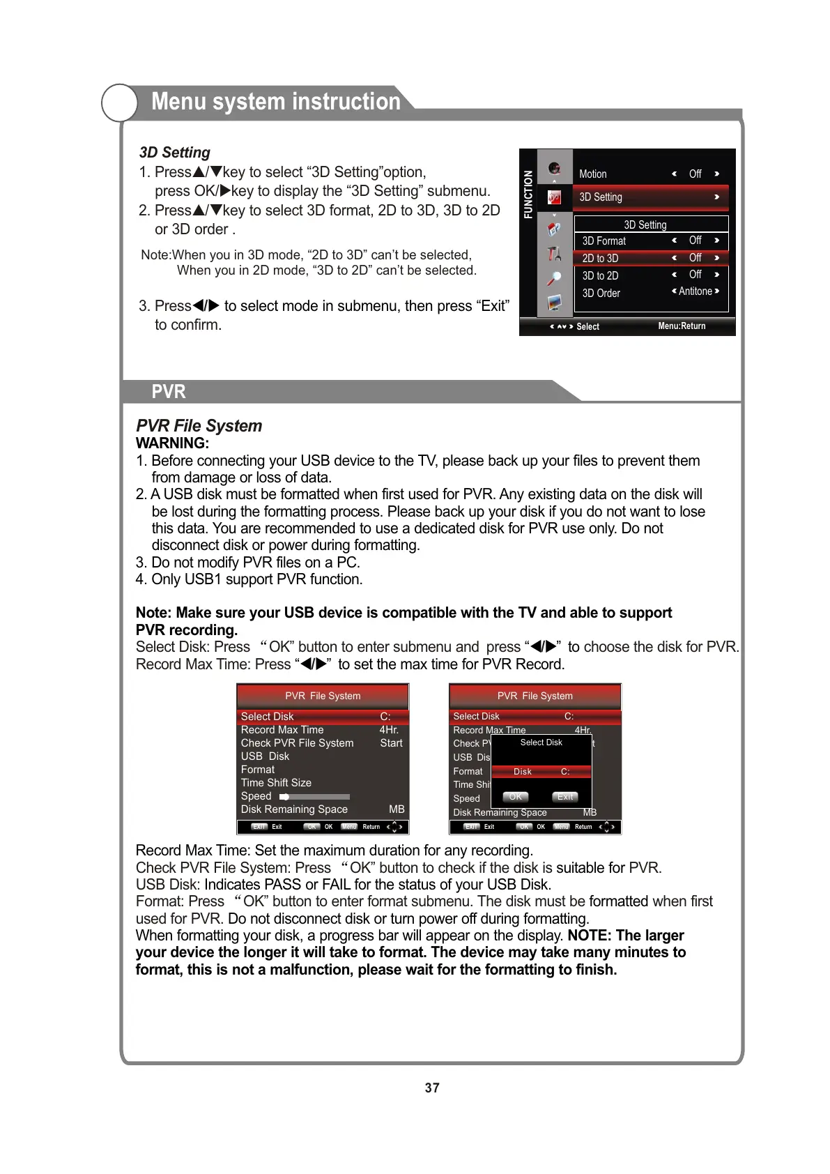 2. A USB disk must be formatted when first used for PVR. Any existing data on the disk will