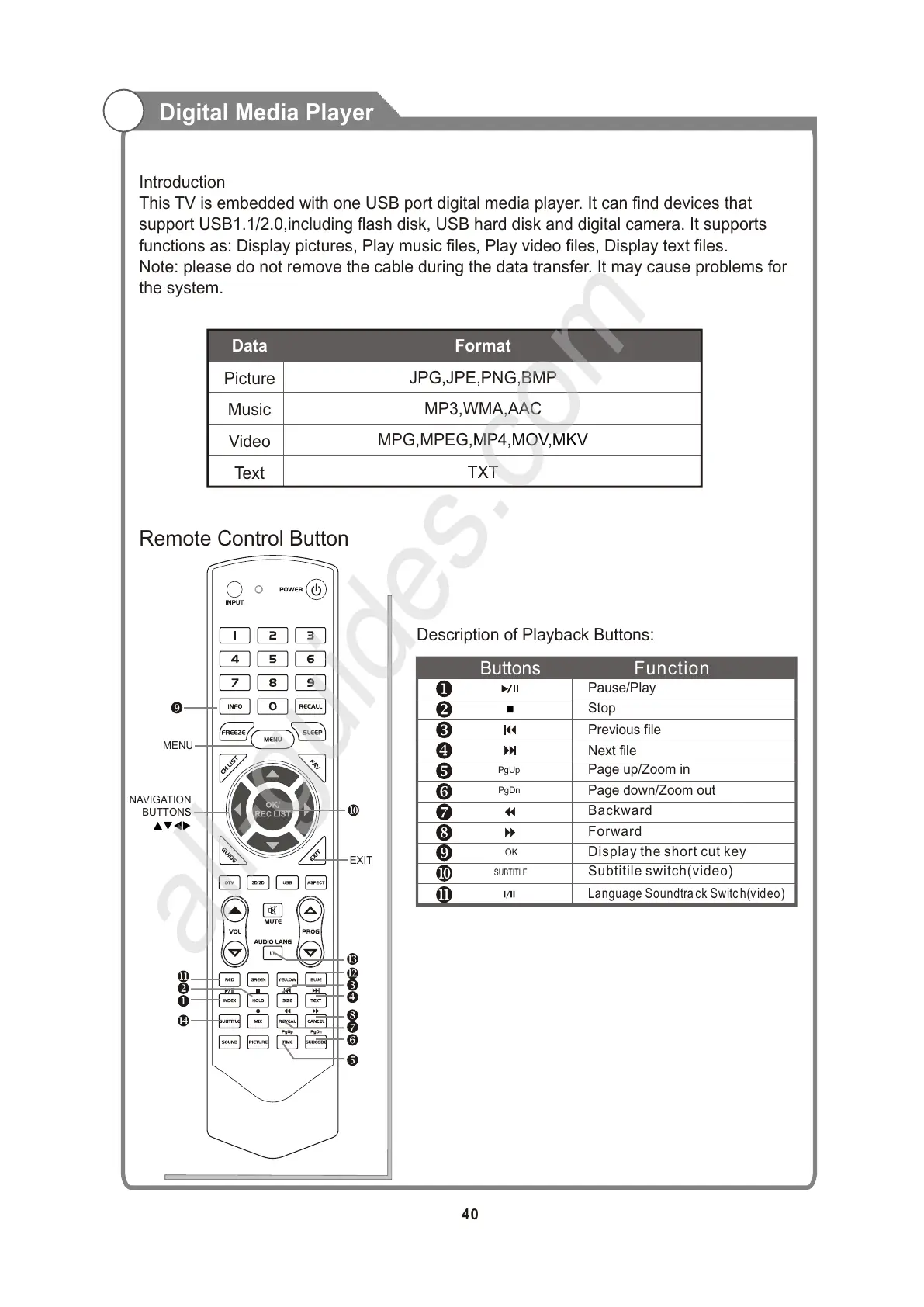 functions as: Display pictures, Play music files, Play video files, Display text files.