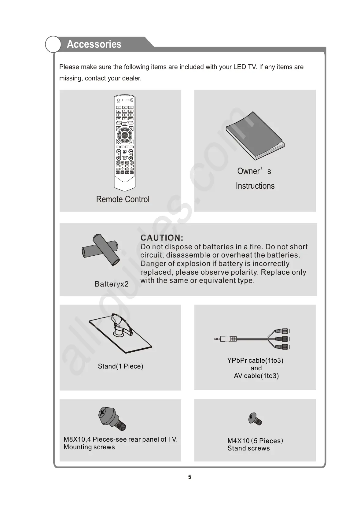 Please make sure the following items are included with your LED TV. If any items are