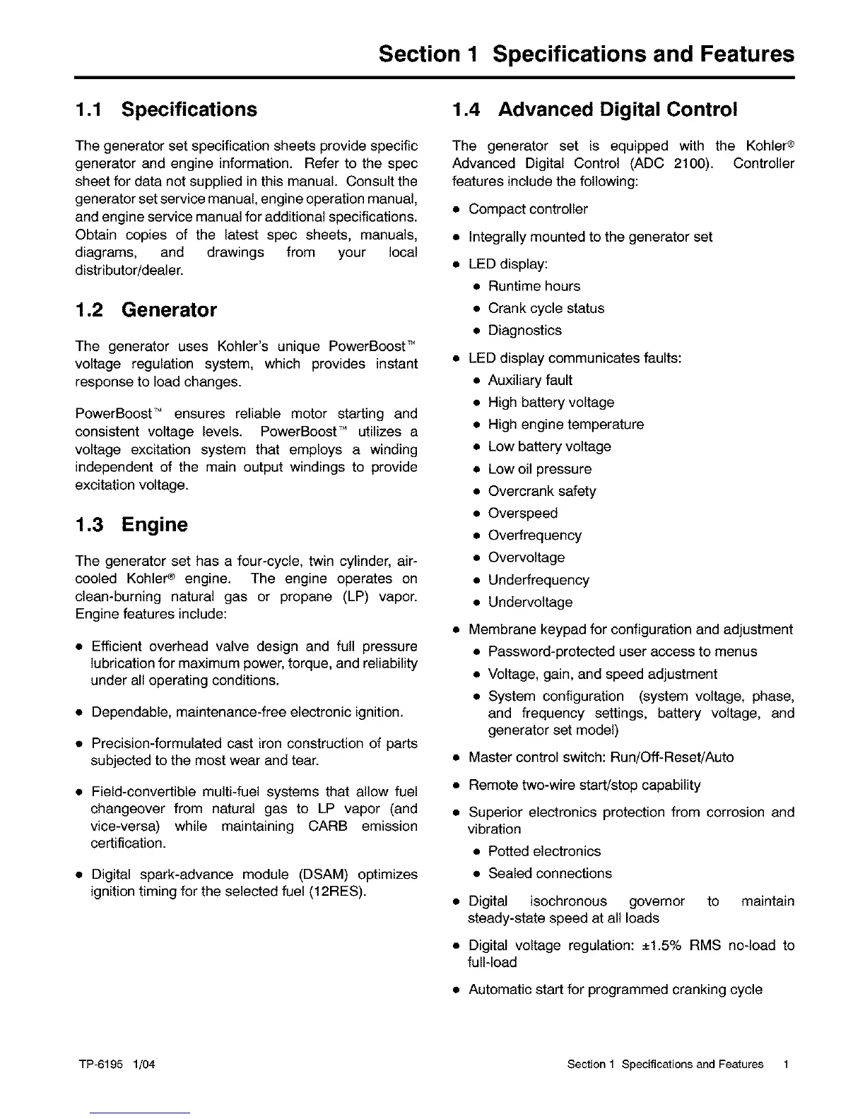 TP-6195 1/04 Section 1 Specifications and Features 1