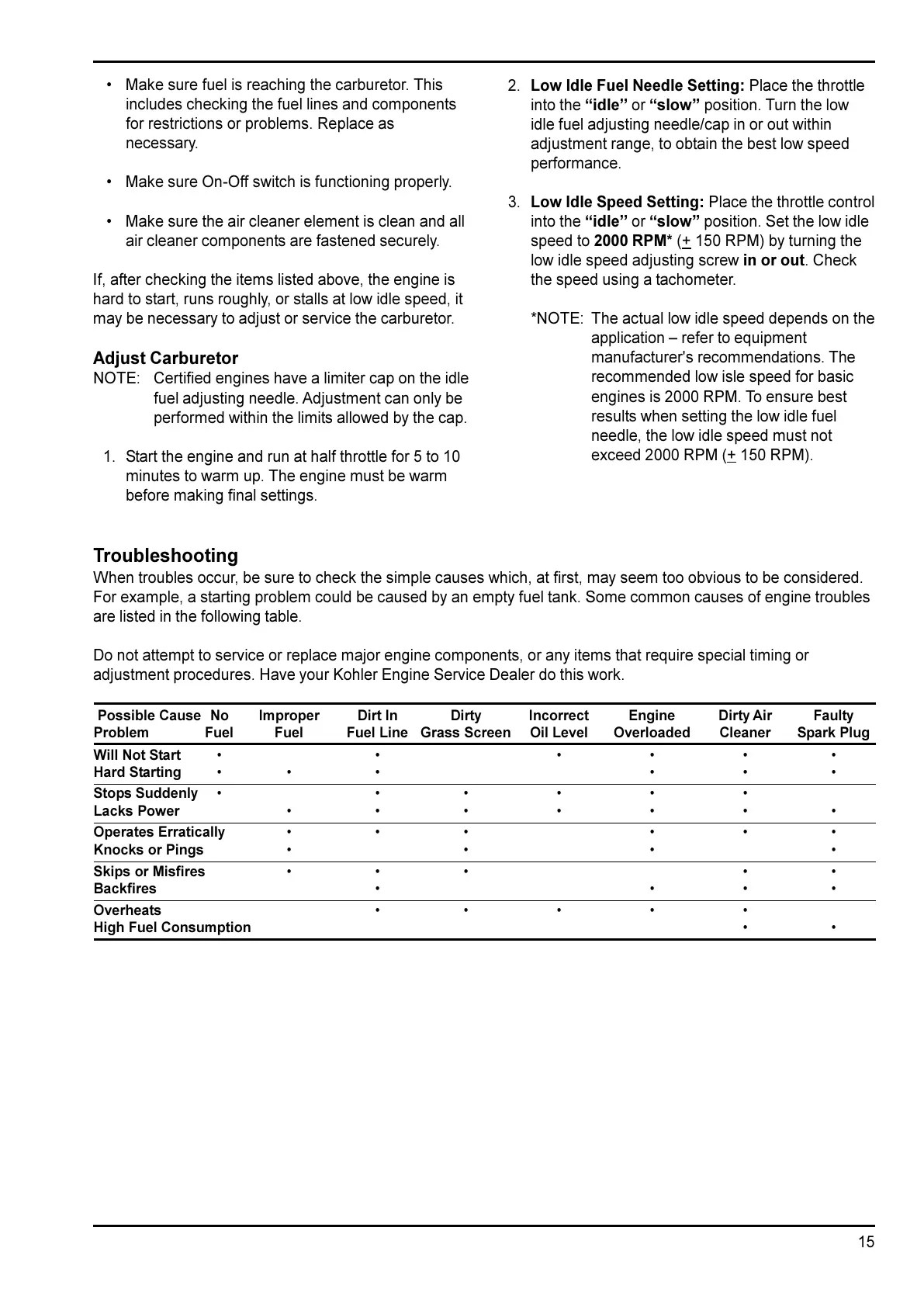 adjustment procedures. Have your Kohler Engine Service Dealer do this work.