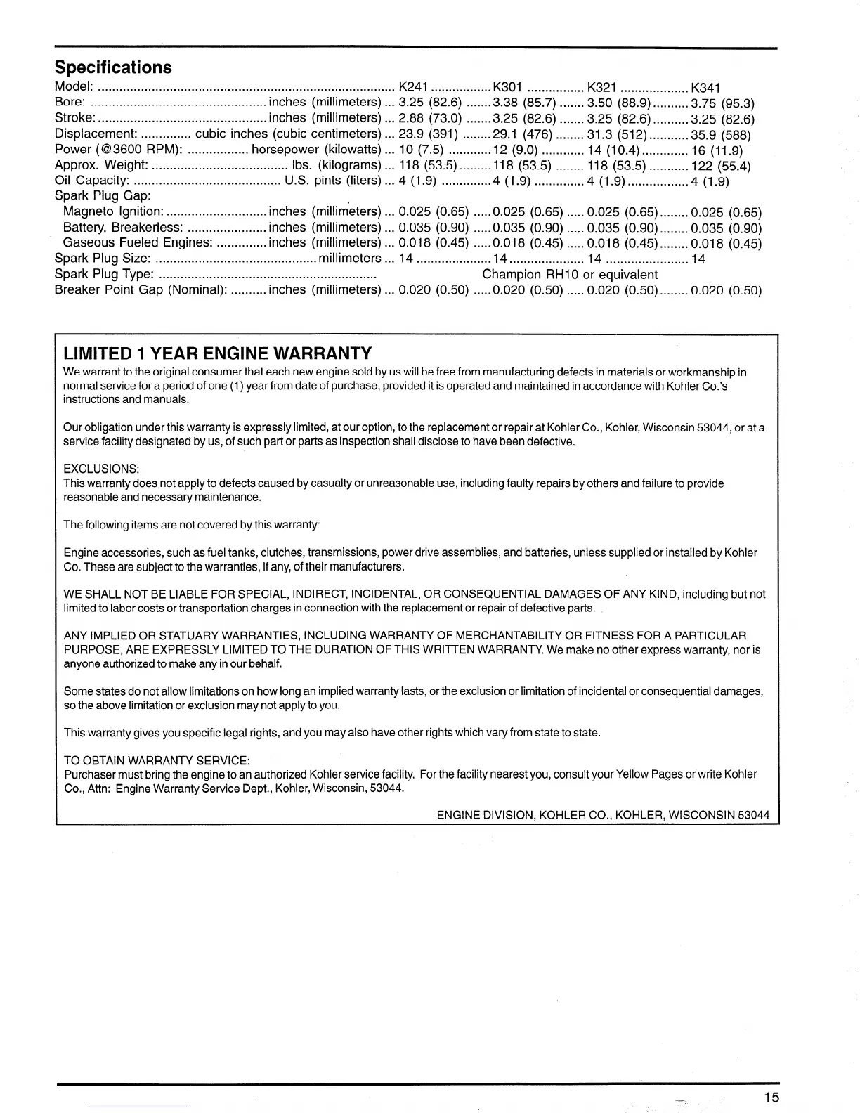 Co., Attn: Engine Warranty Service Dept., Kohler, Wisconsin, 53044.