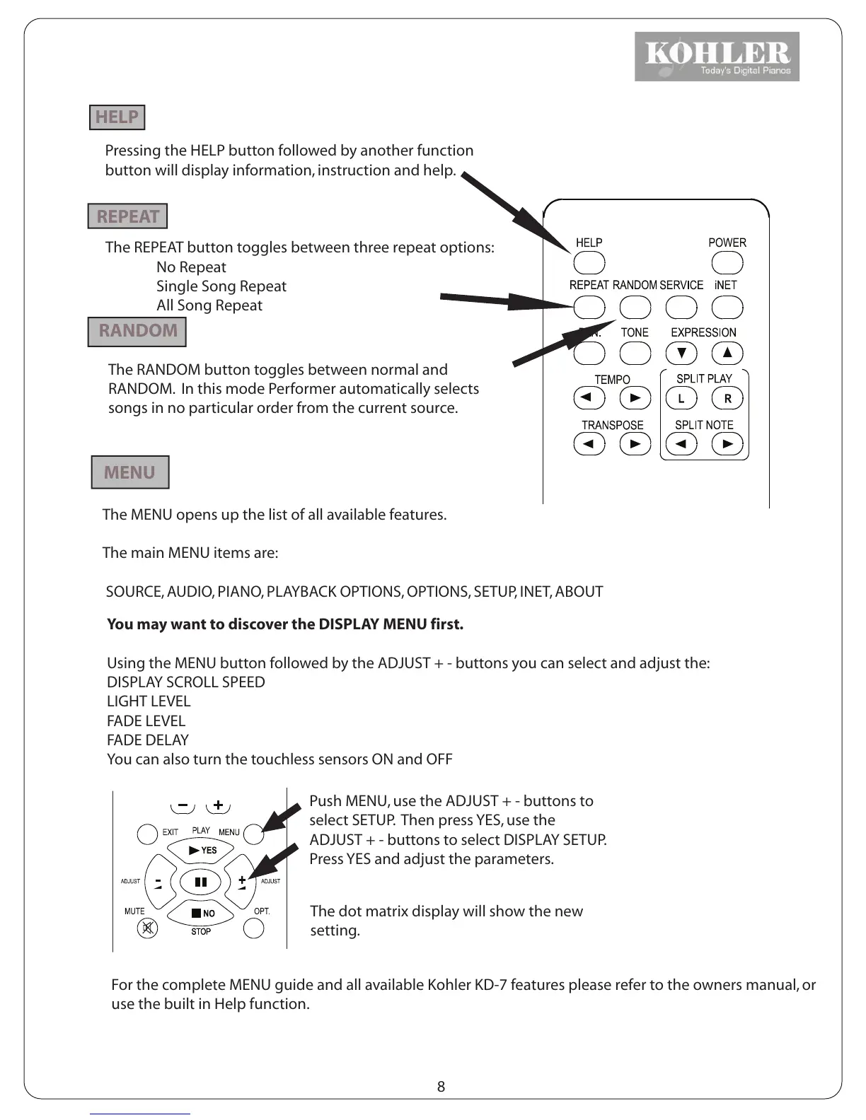 For the complete MENU guide and all available Kohler KD-7 features please refer to the owners manual, or