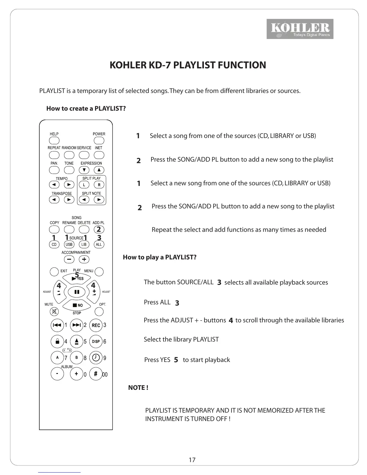 KOHLER KD-7 PLAYLIST FUNCTION