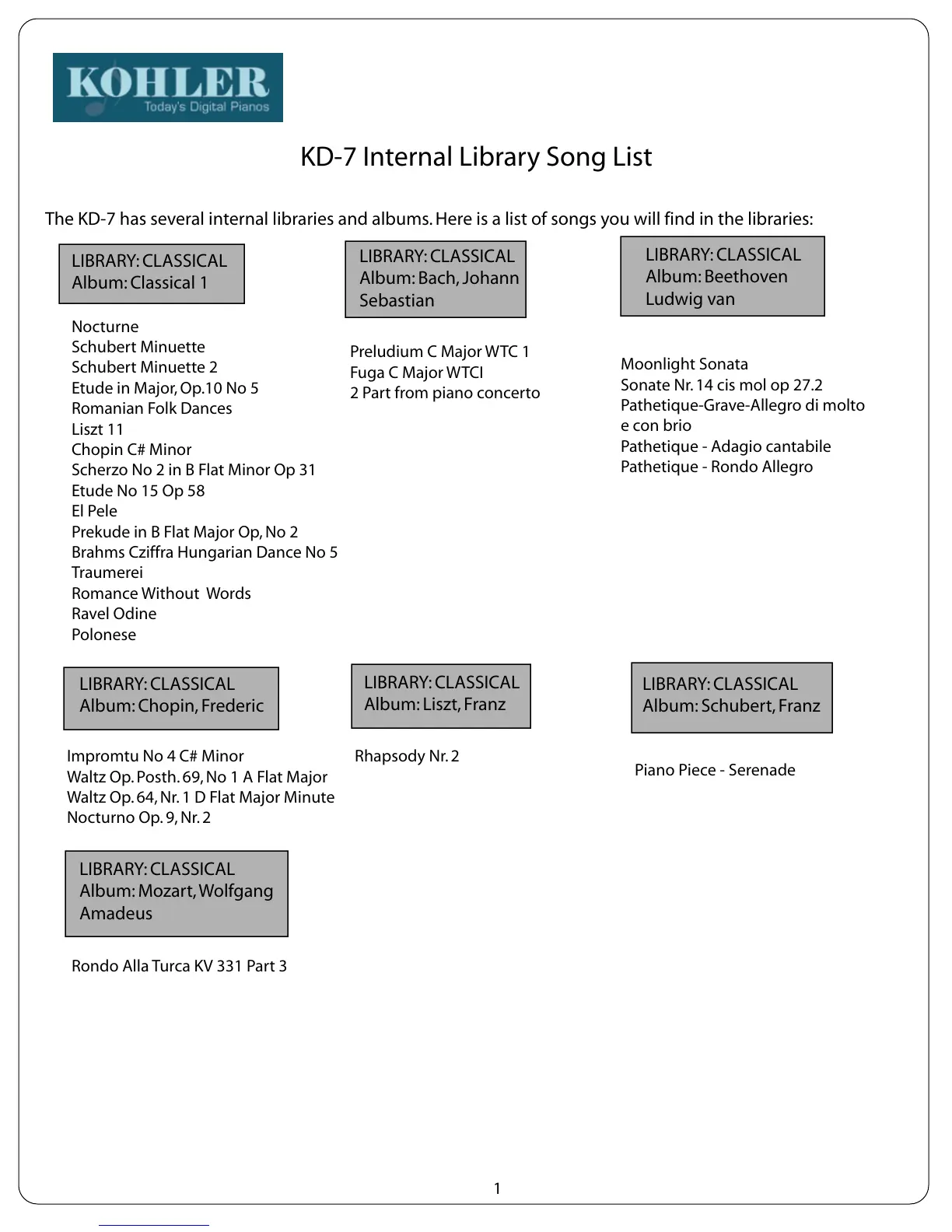 The KD-7 has several internal libraries and albums. Here is a list of songs you will find in the libraries: