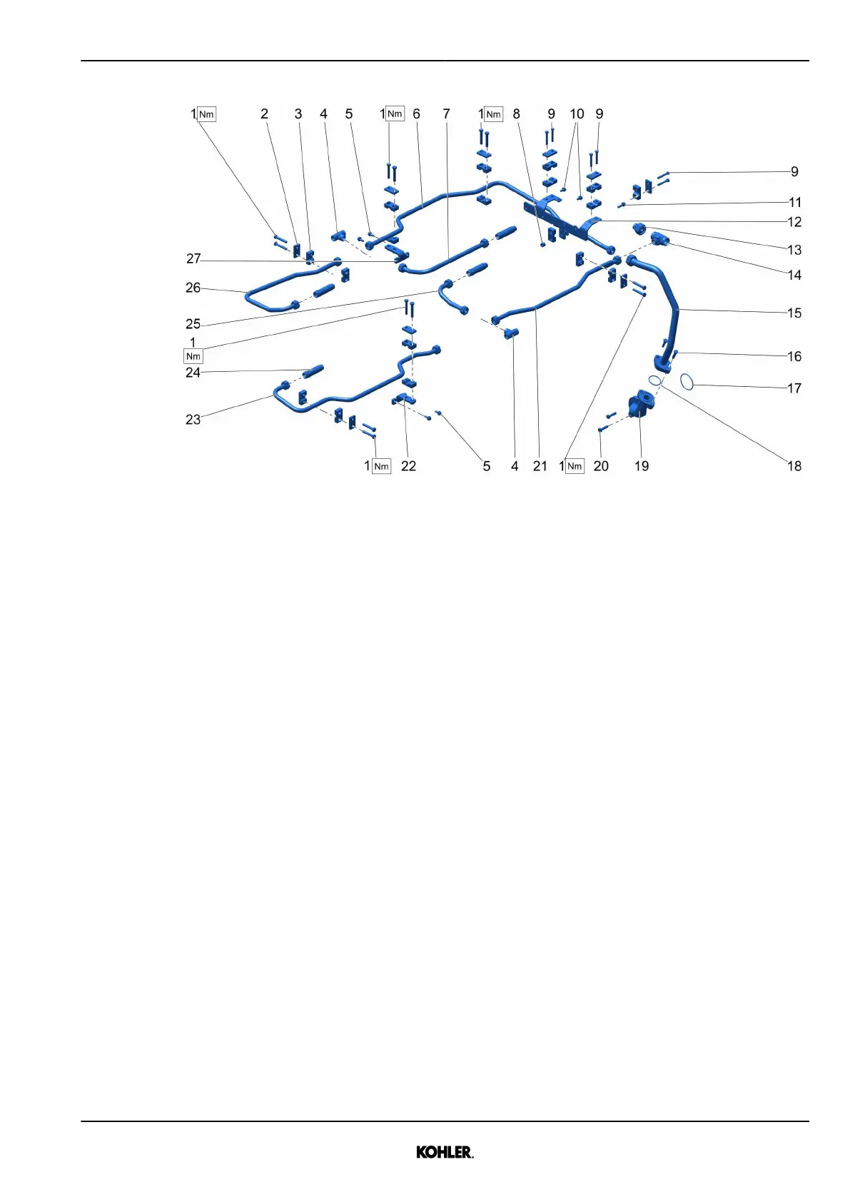 u Mount pipes 6, 7, 15, 21, 23, 25, 26 with T connectors 4, 14 and flange joint 13.