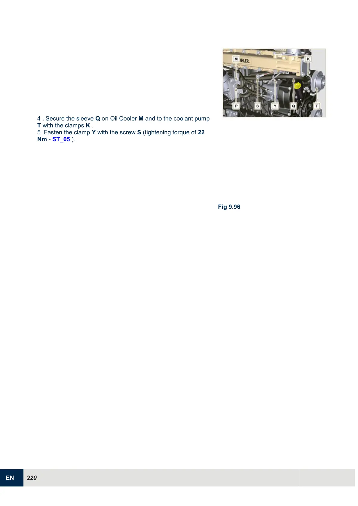 4 . Secure the sleeve Q on Oil Cooler M and to the coolant pump