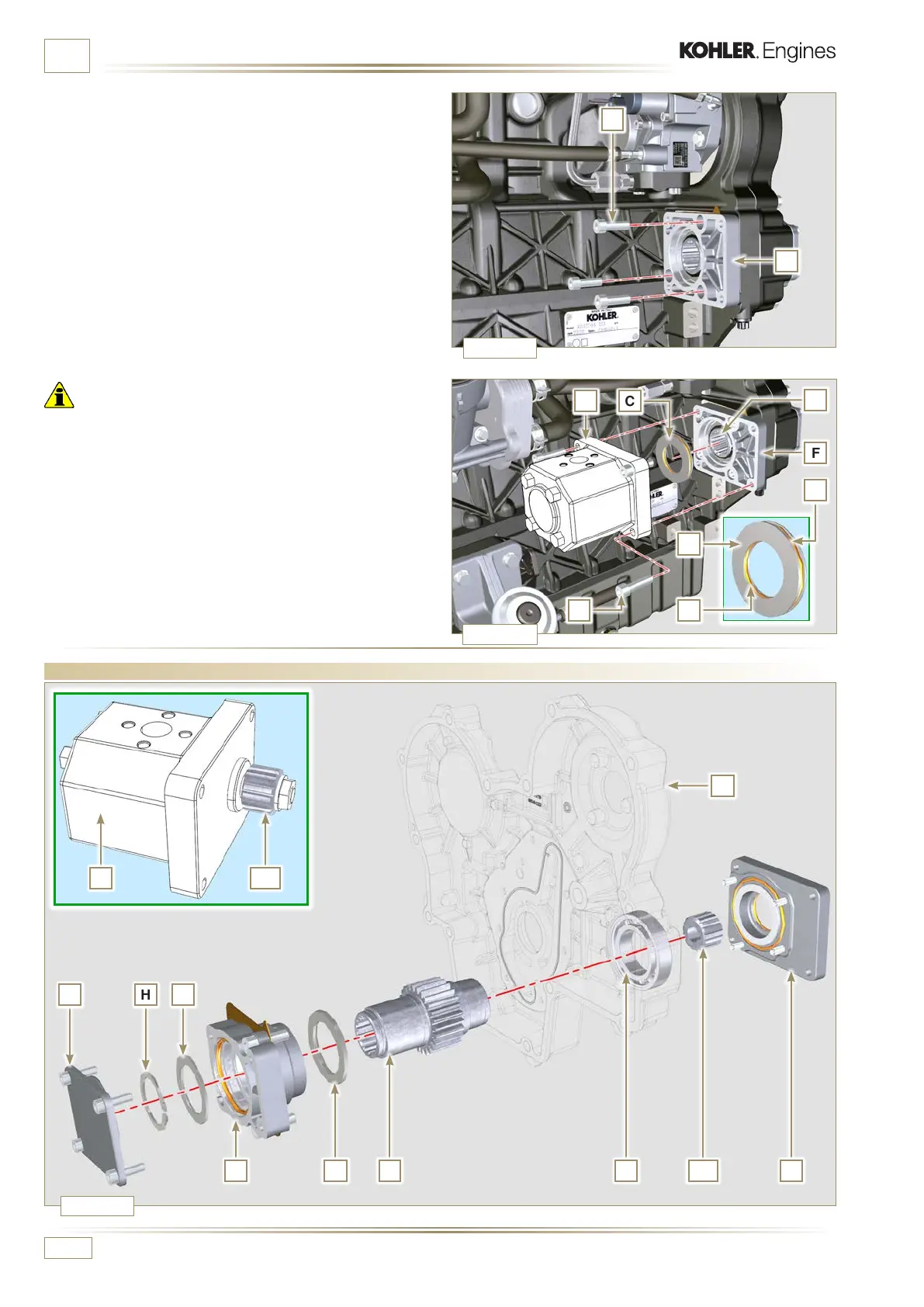 6 - Position the pump B on the flange F engaging the gear H.