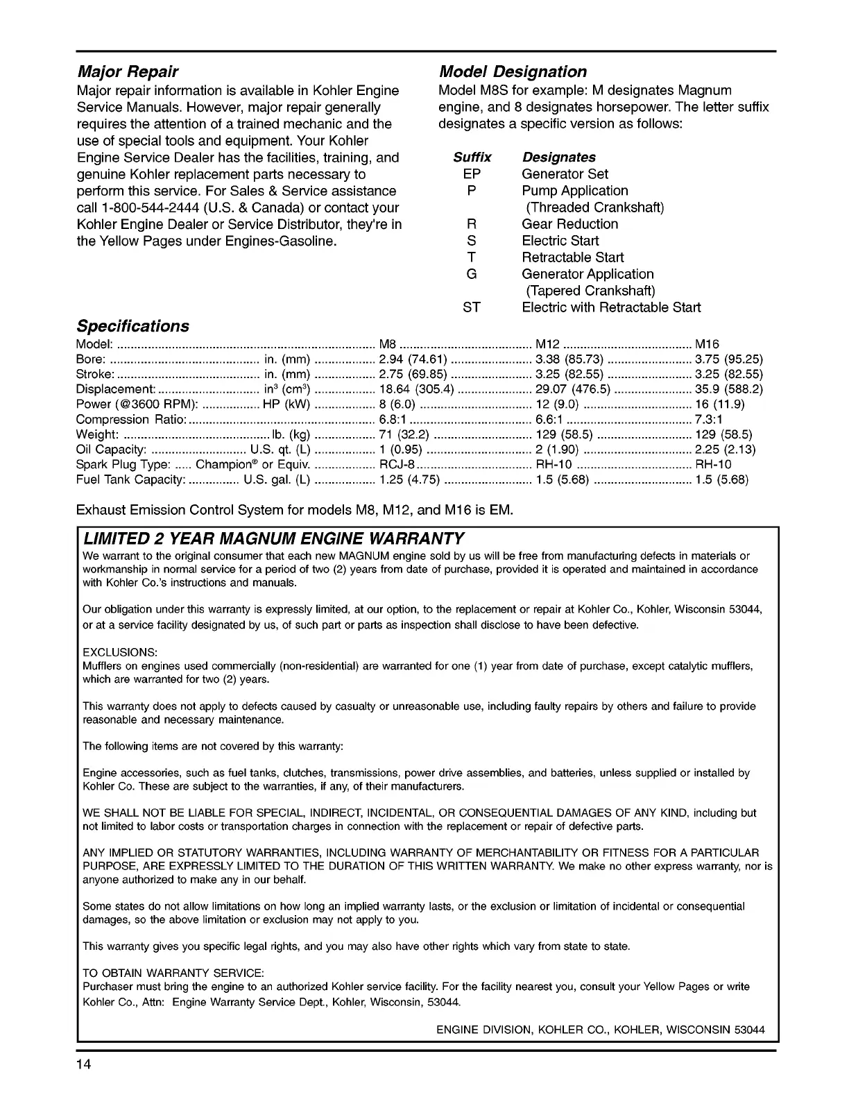 Purchaser must bring the engine to an authorized Kohler service facility. For the facility nearest you, consult your Yellow Pages or write