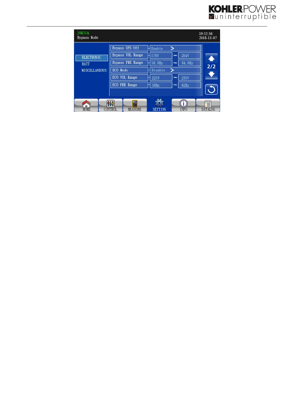 ◼ H: High voltage point for bypass. The setting range is 231V ~ 264V when UPS is HV system.