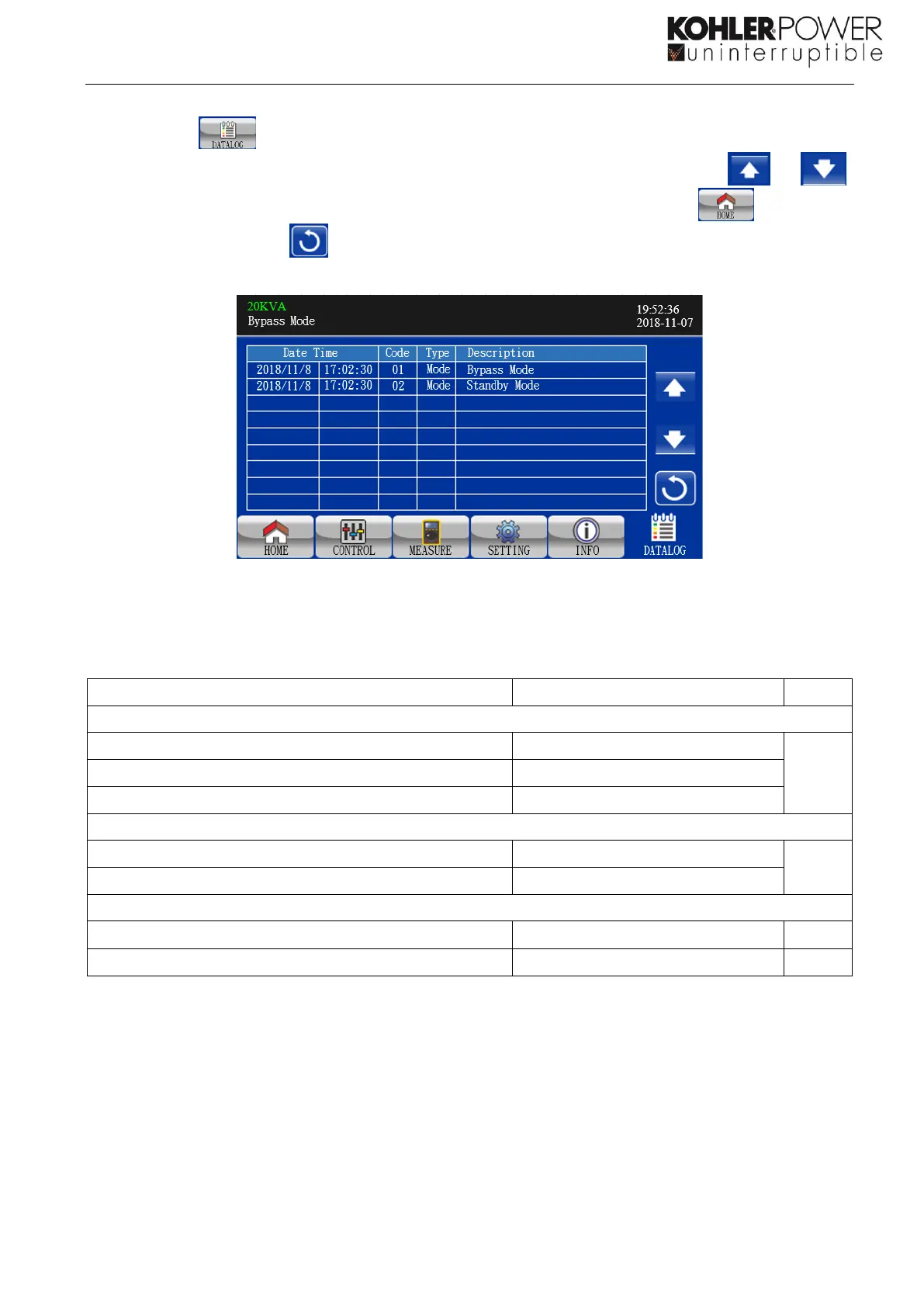 to page up or down if there are more than one page in the date log. Touch the icon to return to