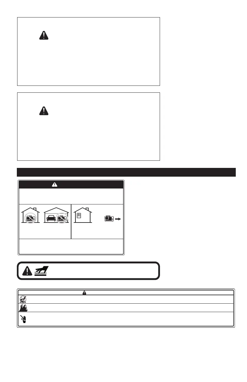 ● Do not fill fuel tank while generator is hot or running. / No llene el tanque de combustible mientras el generador esté caliente o funcionando. / N'ajoutez pas de carburant si le moteur est chaud ou s'il tourne.