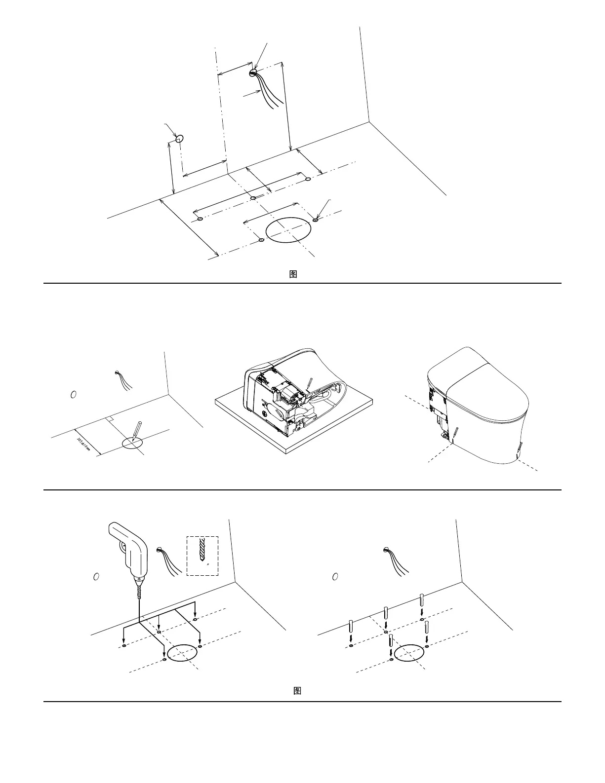 座便器平稳对准地面上的中心线。记下左右地脚孔的位置
