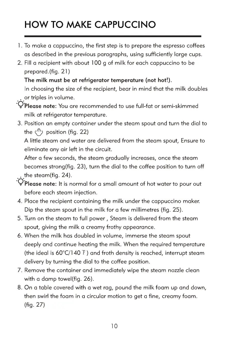 Dip the steam spout in the milk for a few millimetres (fig. 25).
