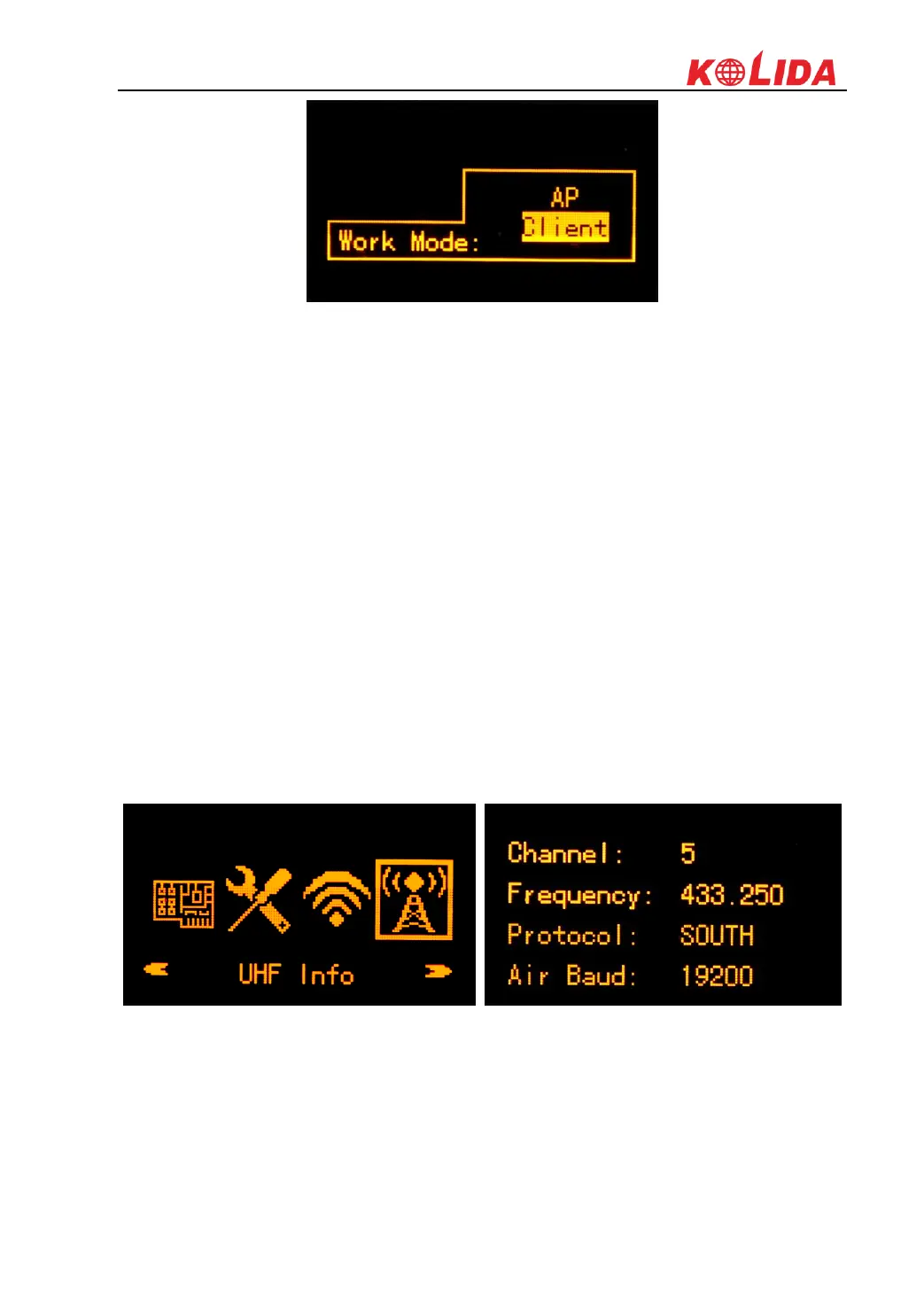 If the internal UHF mode is setup for Base or Rover, the UHF Info item will be displayed at
