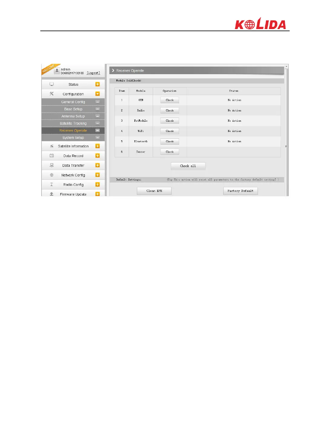 The page provides all kinds of operations to control the receiver such as self-check operation,