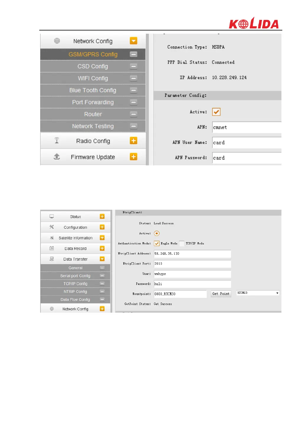 3) Go to “NTRIP Config” interface under “Data Transfer”, and input the CORS server