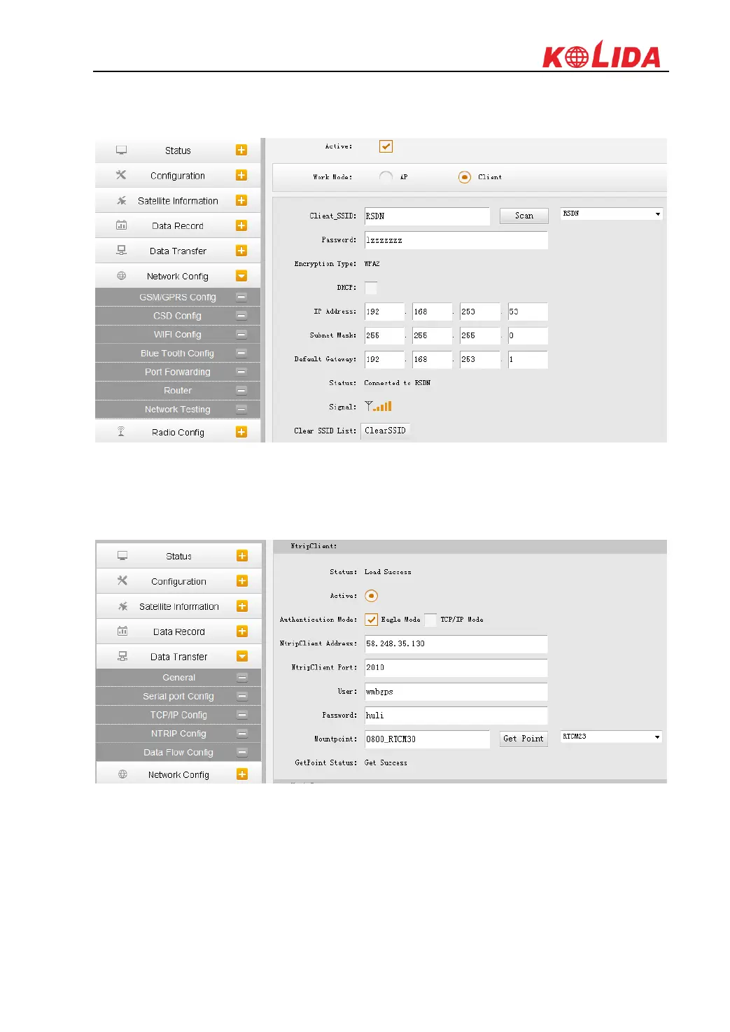 4) If the WIFI connection is successfully connected, go to “NTRIP Config” interface under