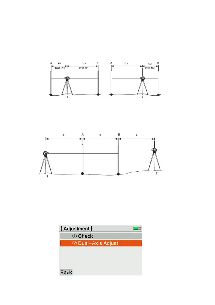 Set the equipment at 1/3 between two staffs. The distance between two staffs should be