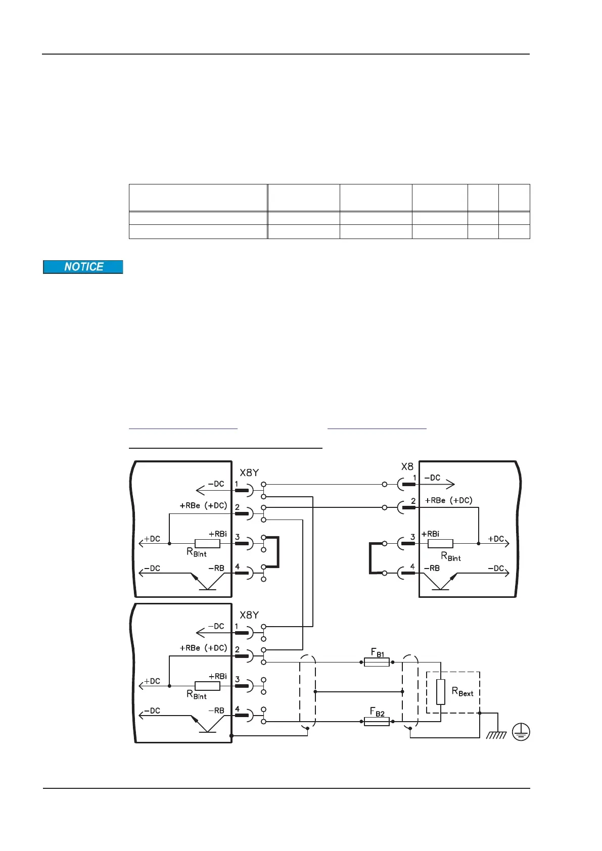 Terminals X8/1 (-DC) and X8/2 (+RBe). Can be connected in parallel, whereby the brake